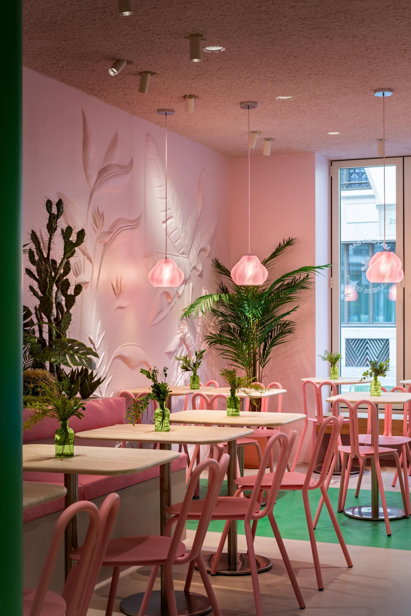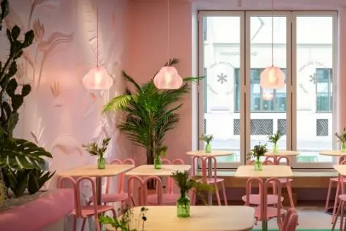 Ззовні заклад виглядає досить спокійно: молочний фасад із лаконічними вивісками з назвою та логотипом і скляна система вікон, що згортається. Однак усередині основним кольором є яскраво-рожевий.