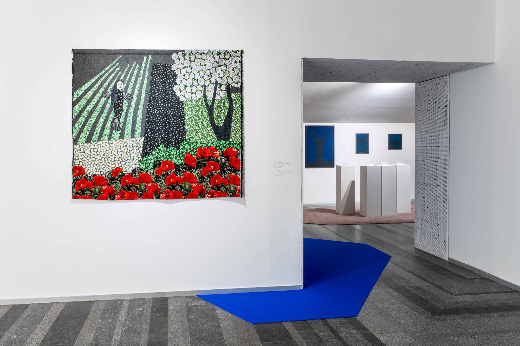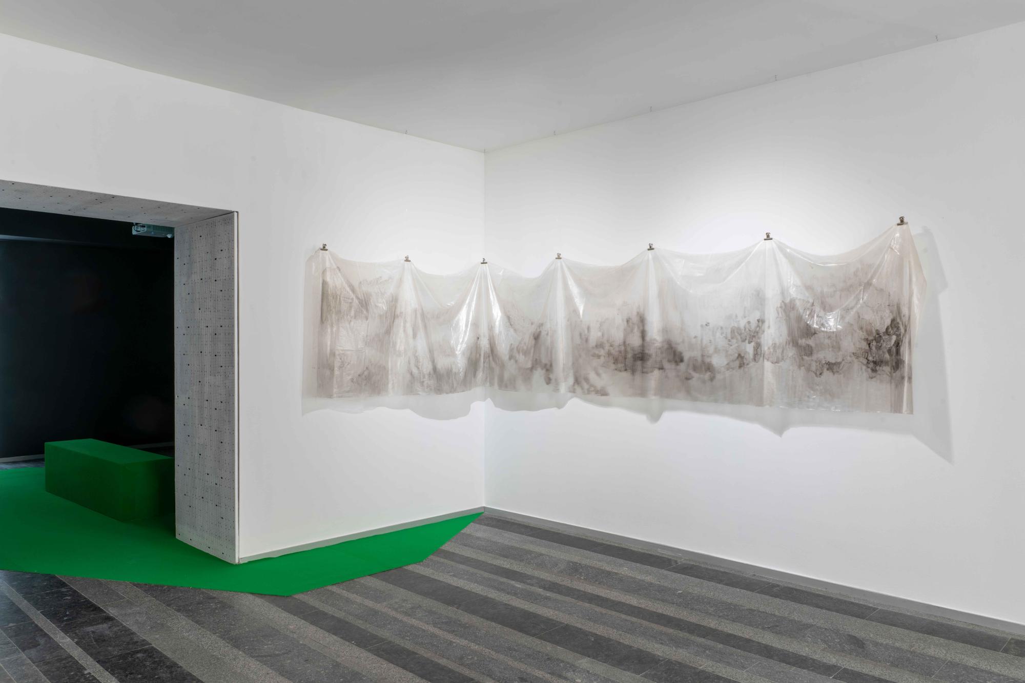 Один із перших “островів” — робота Катерини Лисовенко, коло з артефактів із російського “Ермітажу”, які були вивезені з південної України. Інший — пейзажі затопленої частини Херсонщини із поліетилену, зроблені Вікторією Розенцвейг. Її ландшафти водночас є головним оповідачем історії та простором відсутності: його неможливо розгледіти повністю, він то проявляється, то зникає, наче горизонт, який завжди віддаляється.