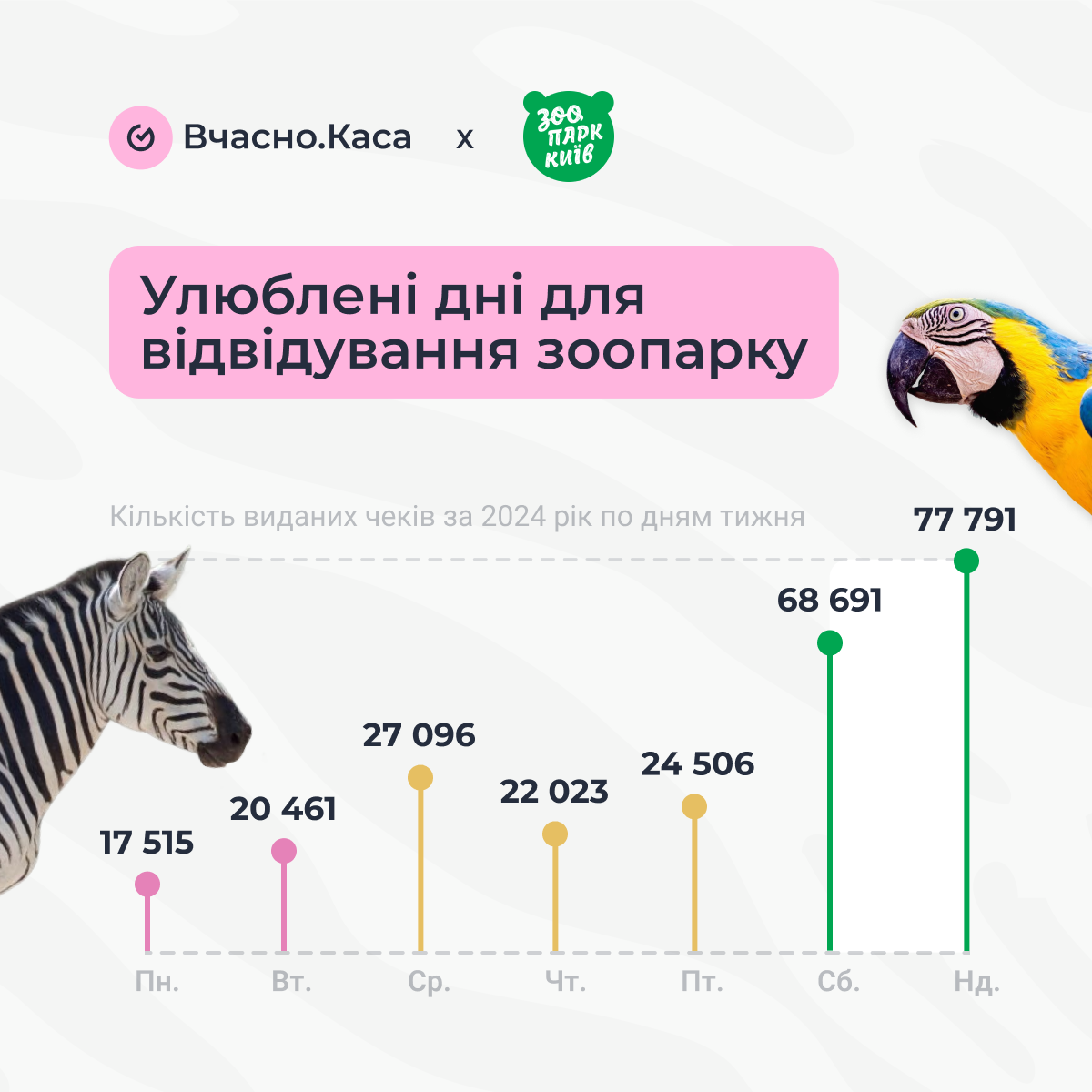 Київський зоопарк зберігає високу популярність серед мешканців столиці. Згідно з даними фіскальних чеків сервісу «Вчасно.Каса», влітку 2025 року заклад відвідували понад 36 тисяч разів щомісяця. Найбільший наплив відвідувачів припадає на вихідні дні, повідомила пресслужба сервісу.