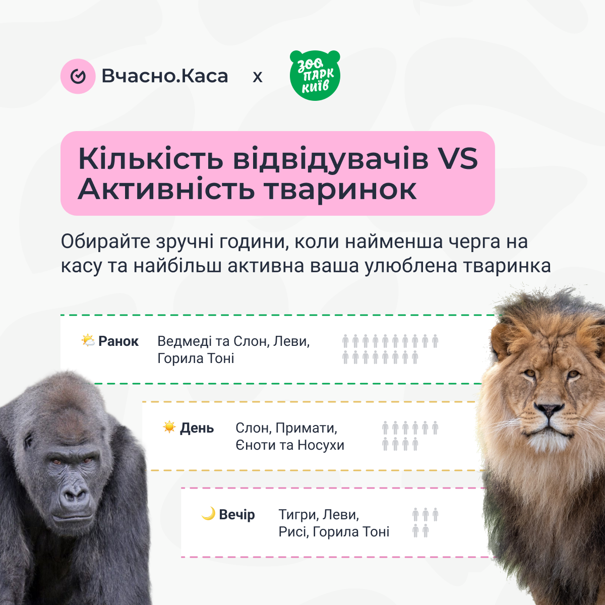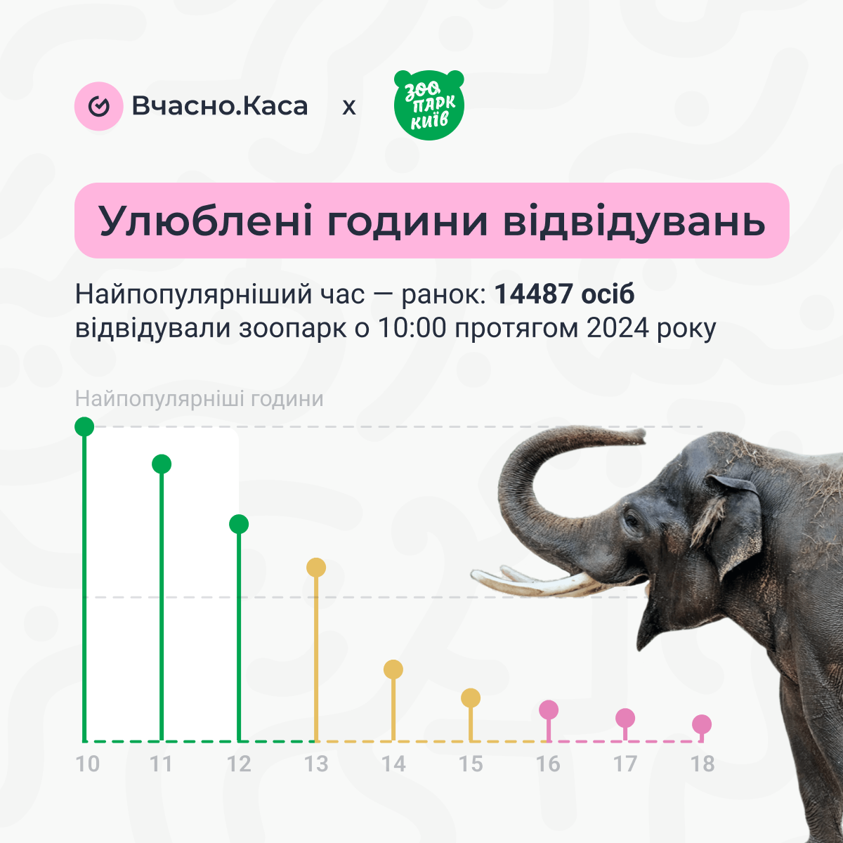 Для уникнення черг у популярні години рекомендовано купувати квитки онлайн через чат-бот, а не при вході. Більшість киян купують онлайн-квитки в неробочий час зоопарку – з 5:00 до 9:00 ранку. Найактивнішими годинами відвідування є ранок (10:00–12:00), тоді як найбільш комфортним часом для прогулянки вважається період із 14:00 до 17:00.