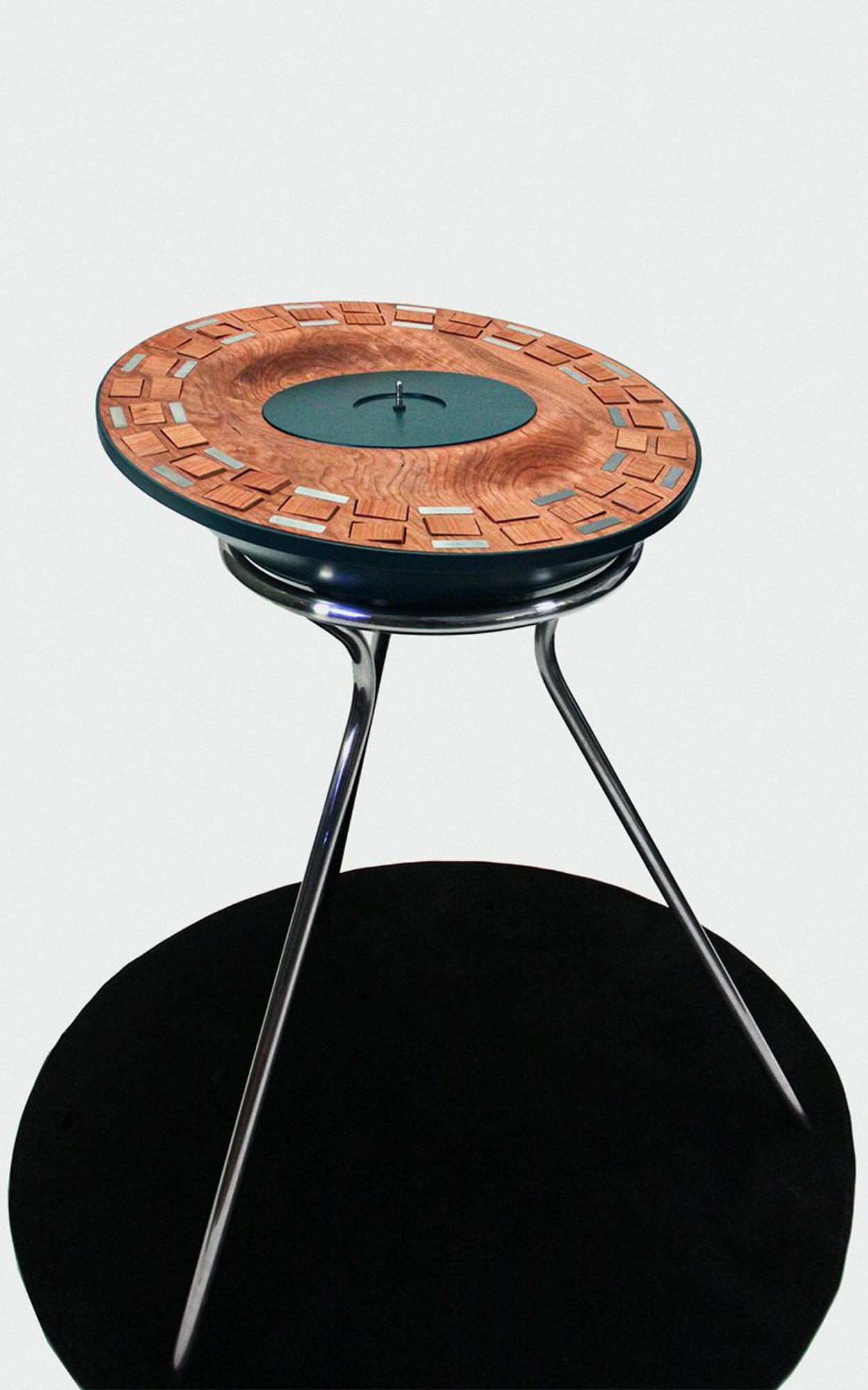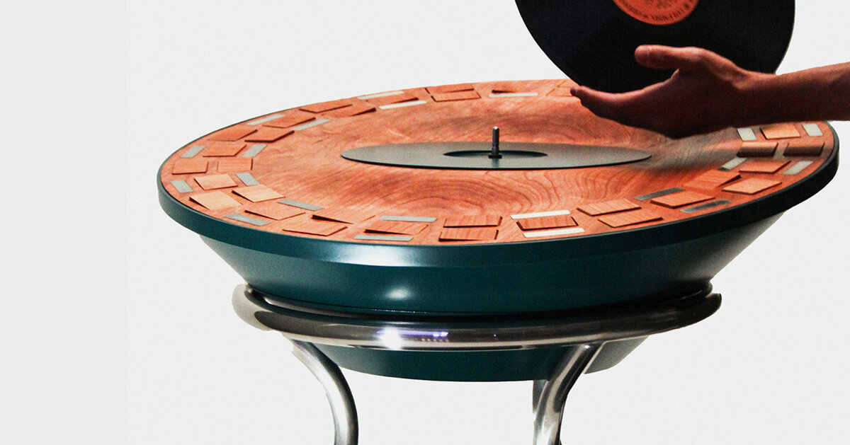Програвач зроблений із вишневої деревини, елементів із нержавіючої сталі та компонентів, надрукованих на 3D-принтері. Щоби виготовити верхню частину з вишневого дерева, дизайнерка співпрацювала з механіком Джейком Гардингом із Forsyth Metal Works. Натуральна текстура дерева контрастує з металевими вставками, а вигнуті ніжки з нержавіючої сталі нагадують програвачі середини ХХ століття.