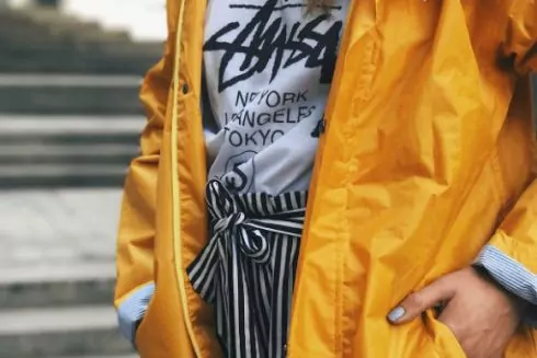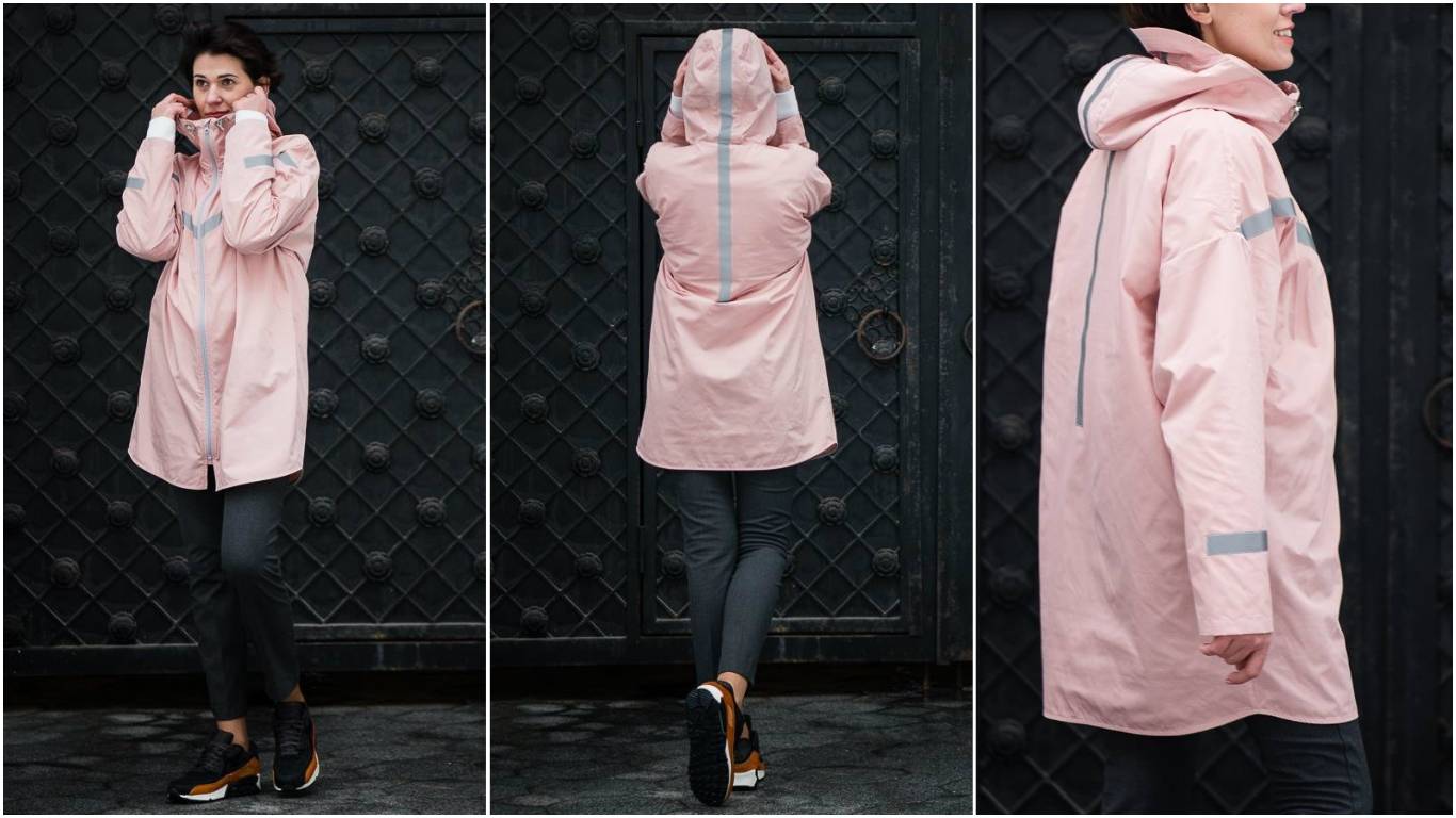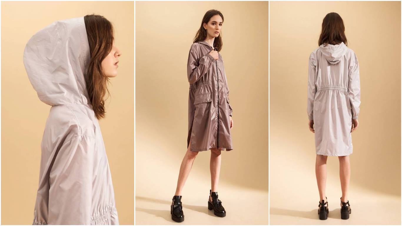 У бренда є дощовик забарвлення Blooming Dahlia – пудровий колір з персиковим підтоном. Він зроблений з плащової тканини, застібається на блискавку. Є дві кишені та каптур. Модель також доступна у сірому кольорі.