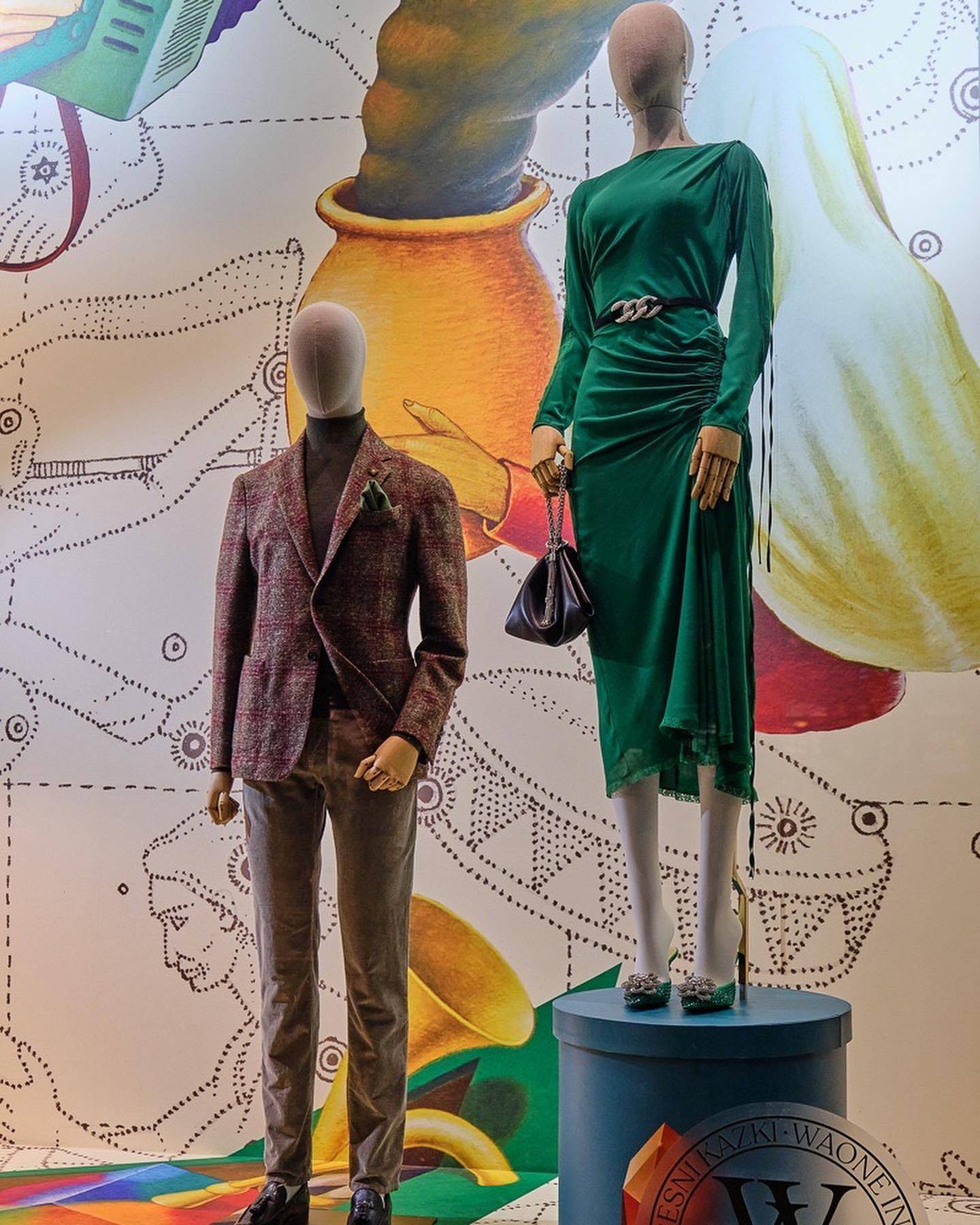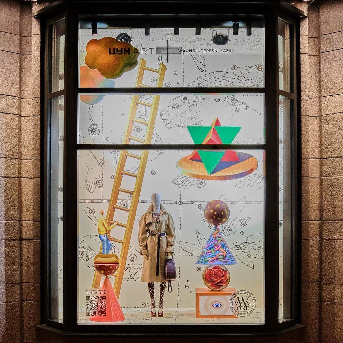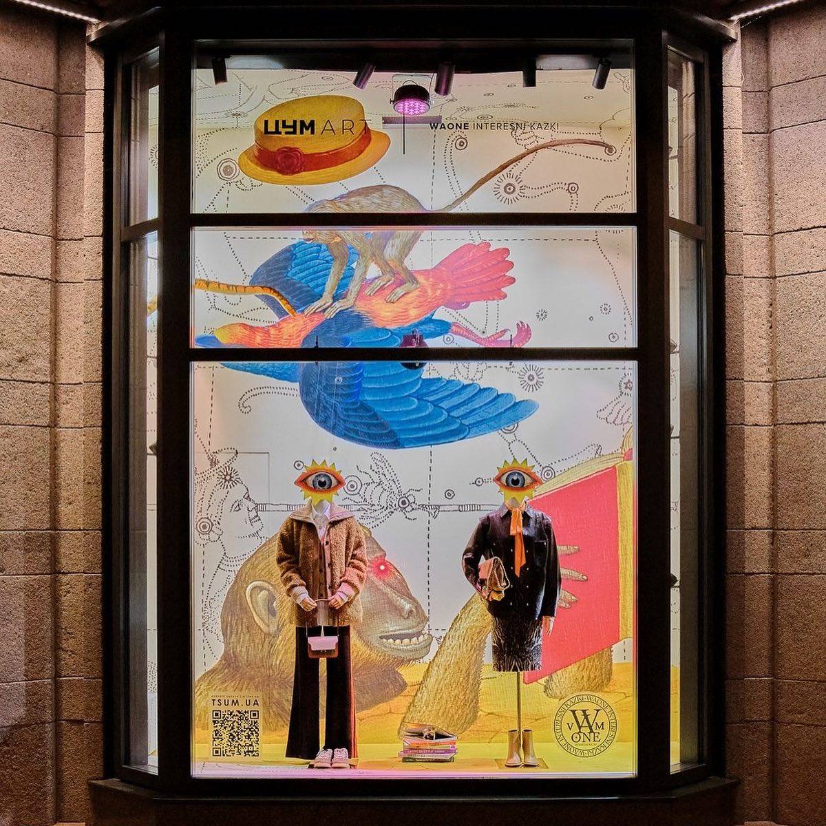 Київський ЦУМ відкрив сім осінніх артвітрин з роботами художника-мураліста Володимира Манжоса, також відомого як WaOne Interesni Kazki.