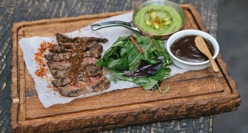 Ціни: телячі мізки, петрушка і зелений mayo — 75 грн, салат з печеного баклажана, шпинату з азіатською заправкою — 140 грн, стейк тартар, крем із зеленої цибулі та васабі — 280 грн, кролик-біфштекс із цвітною капустою з тхіною — 190 грн, рибай на кістці — 180 грн, десерти — 120 грн