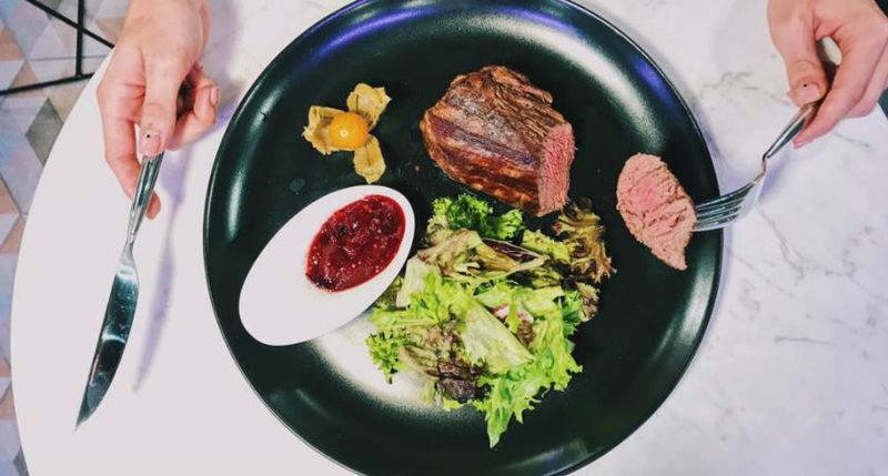 В меню — шаурма-стейк, який подається з буряком і хроном, бургер з котлетою з яловичих потрухів, пузо бичка з пюре із зеленого горошку. Також є несолодкі еклери з начинками з телячих мізків або рубаних потрухів курчати.