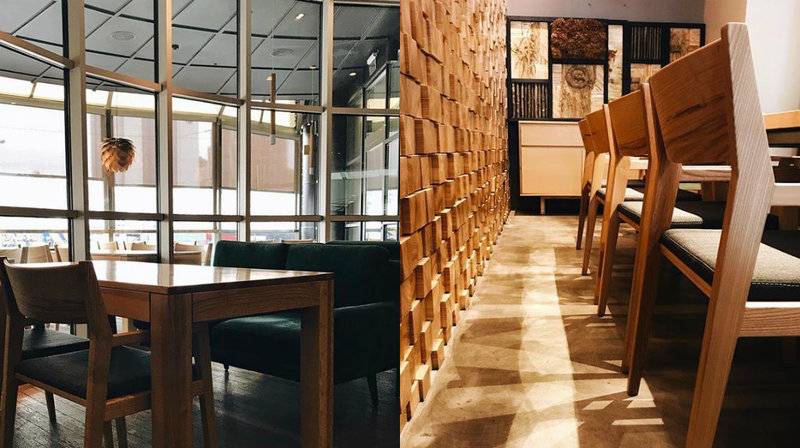 Інтер'єр світлий і просторий. Меблі зроблені з натурального дерева. Завдяки вітражному склінню в SINO багато природного освітлення.