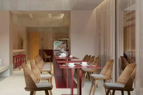 Дизайн закладу розробляла команда AKZ Architectura. В інтер'єрі використовували кольорову палітру десерту Veterano Brownie зі смаком «вишня і дорблю»: дерев'яні стільці – це шоколад, червоні столи – вишня, прозорі світильники і метал – сир дорблю. Айдентику для Veterano Brownie створювали студенти діджитал школи Projector.