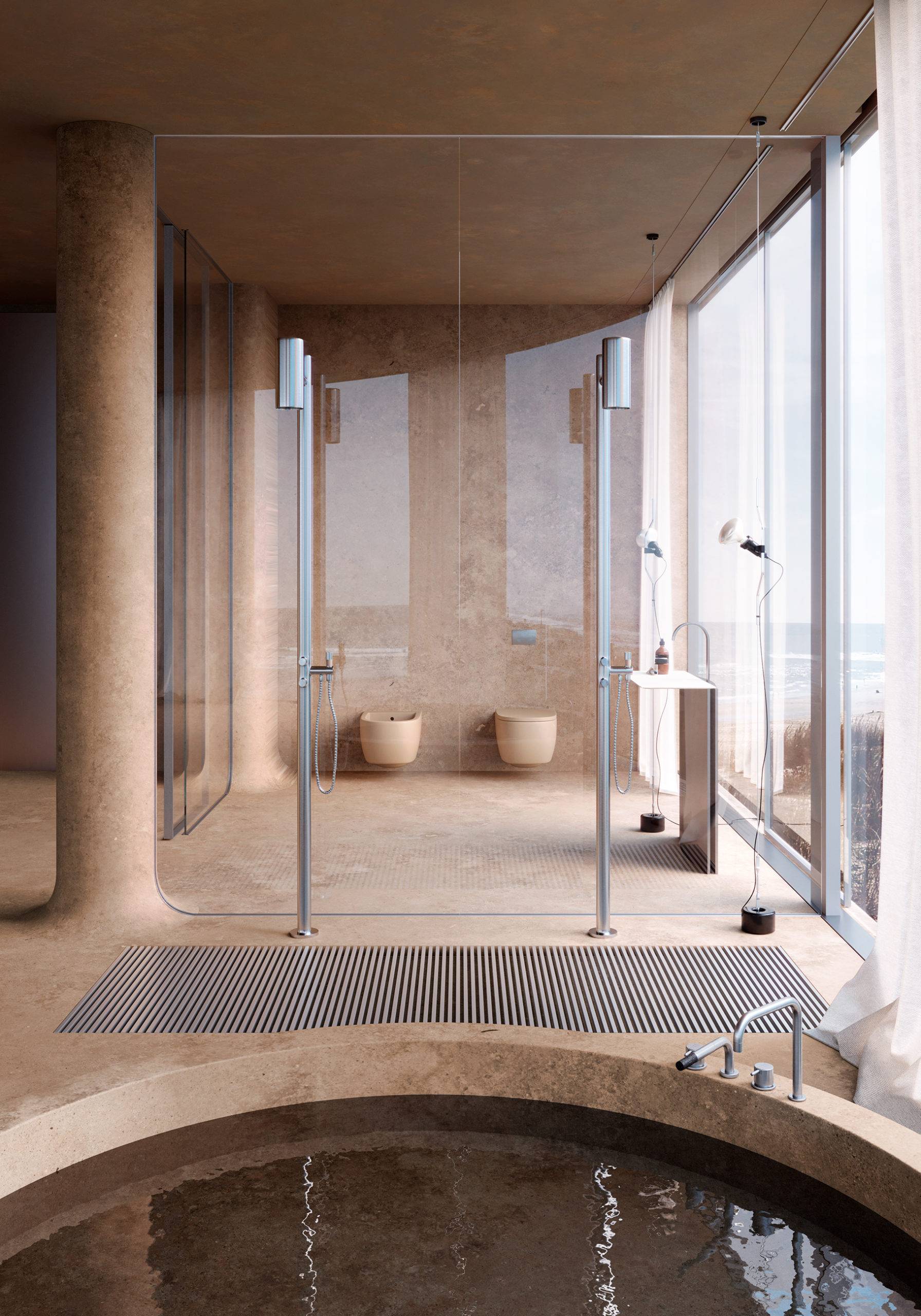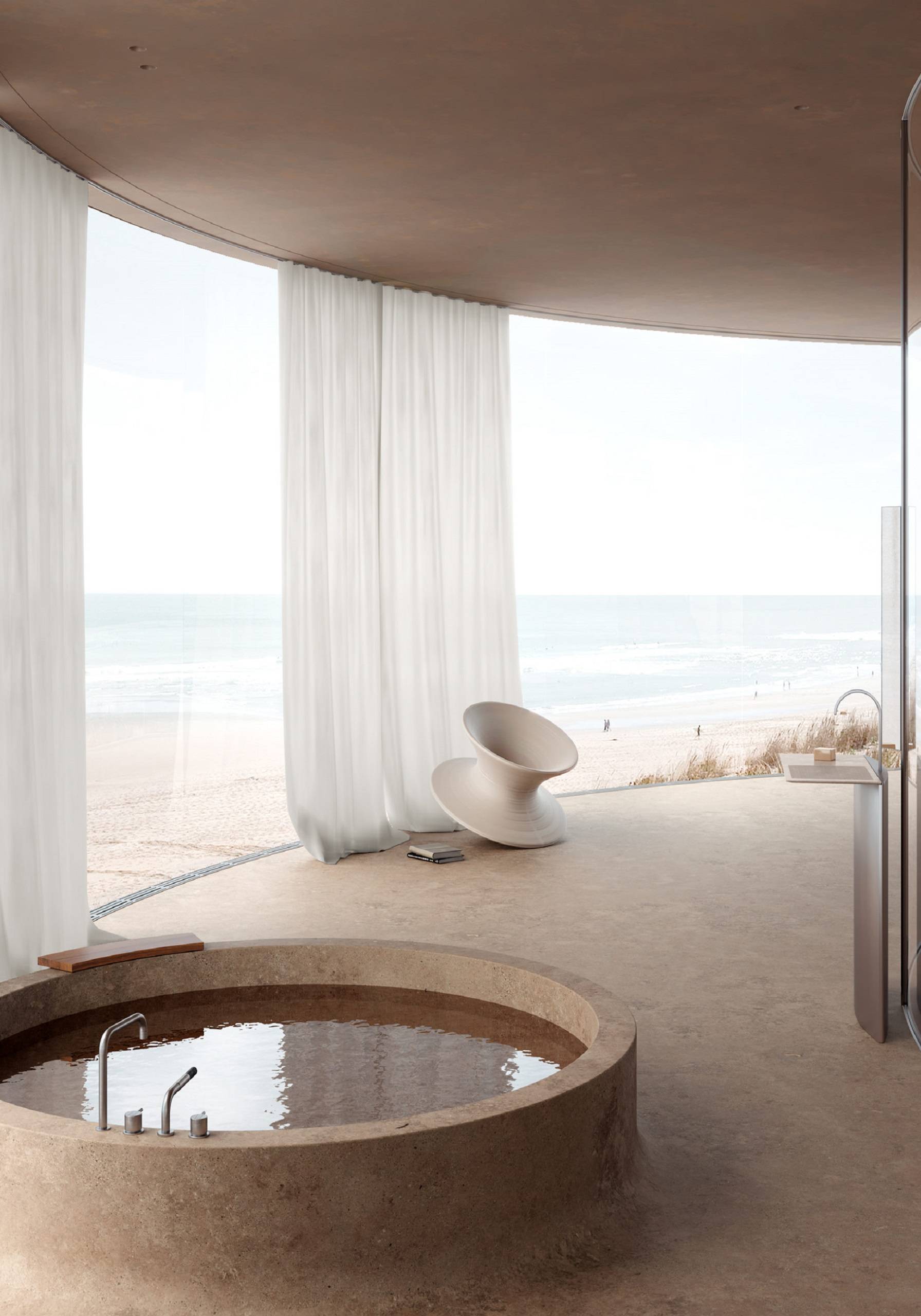 Центральним елементом номера є кругла ванна, яка піднімається над кам'яною підлогою, що створює відчуття купання у гарячому джерелі. Санвузли розміщені всередині номера і відділені прозорими перегородками з технологією «розумного скла». Вони втрачають прозорість при кожному використанні.