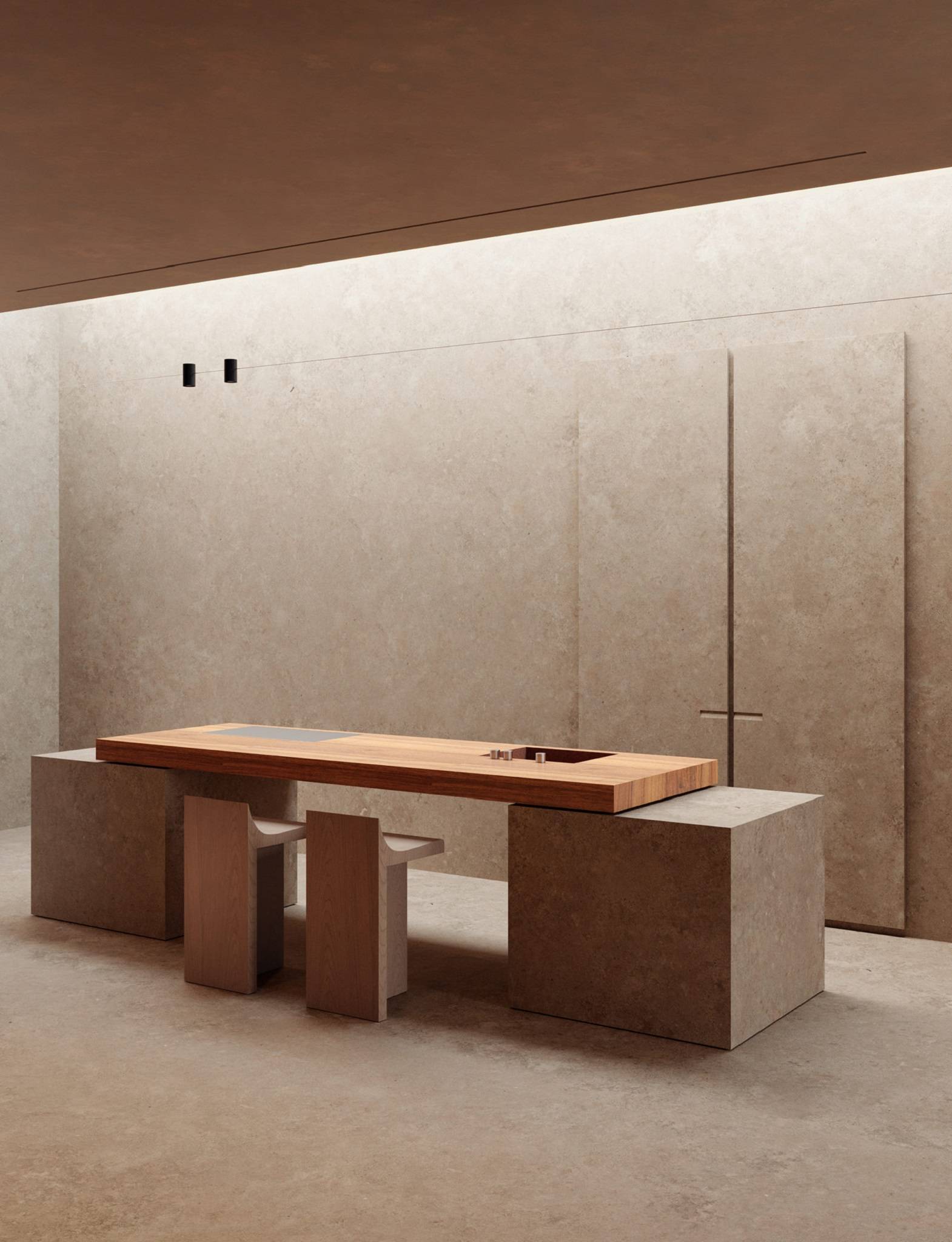В основі проекту – поєднання різних текстур. Наприклад, в спальні тверда кам'яна підлога вкрита м'яким пухнастим килимом. Стільці італійського архітектора Чіні Боєрі виглядають, як холодне скло, але на них зручно сидіти.