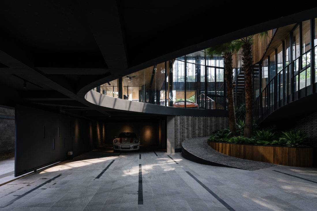 Будинок являє собою сталеву коробку, розташовану над колонами. Проєкт створений для сучасної молодої людини, яка володіє великою колекцією автомобілів. Для них архітектори виділили підвал, розрахований на сім машин.