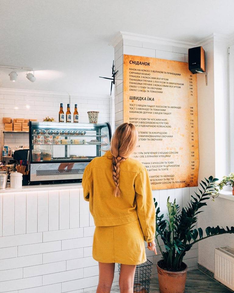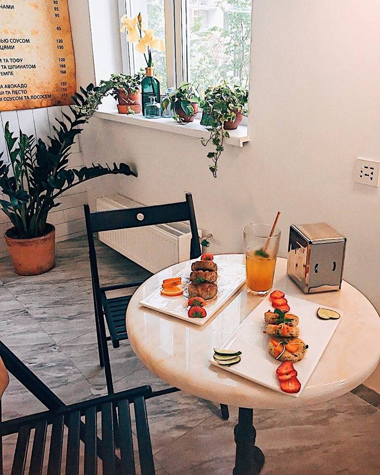 У кафе, яке розташоване неподалік ЖК «Комфорт Таун», можна замовити сирники з тофу і кокосовим йогуртом, гранолу з кокосовим молоком, тости з авокадо і томатами, салат з кіноа, а також бургери з тофу або пшеничною ковбаскою. Також у кафе подають комбучу – напій, який створюється шляхом ферментації чаю за допомогою мікроорганізмів. Комбуча багата на пробіотики і дуже корисна для травлення.