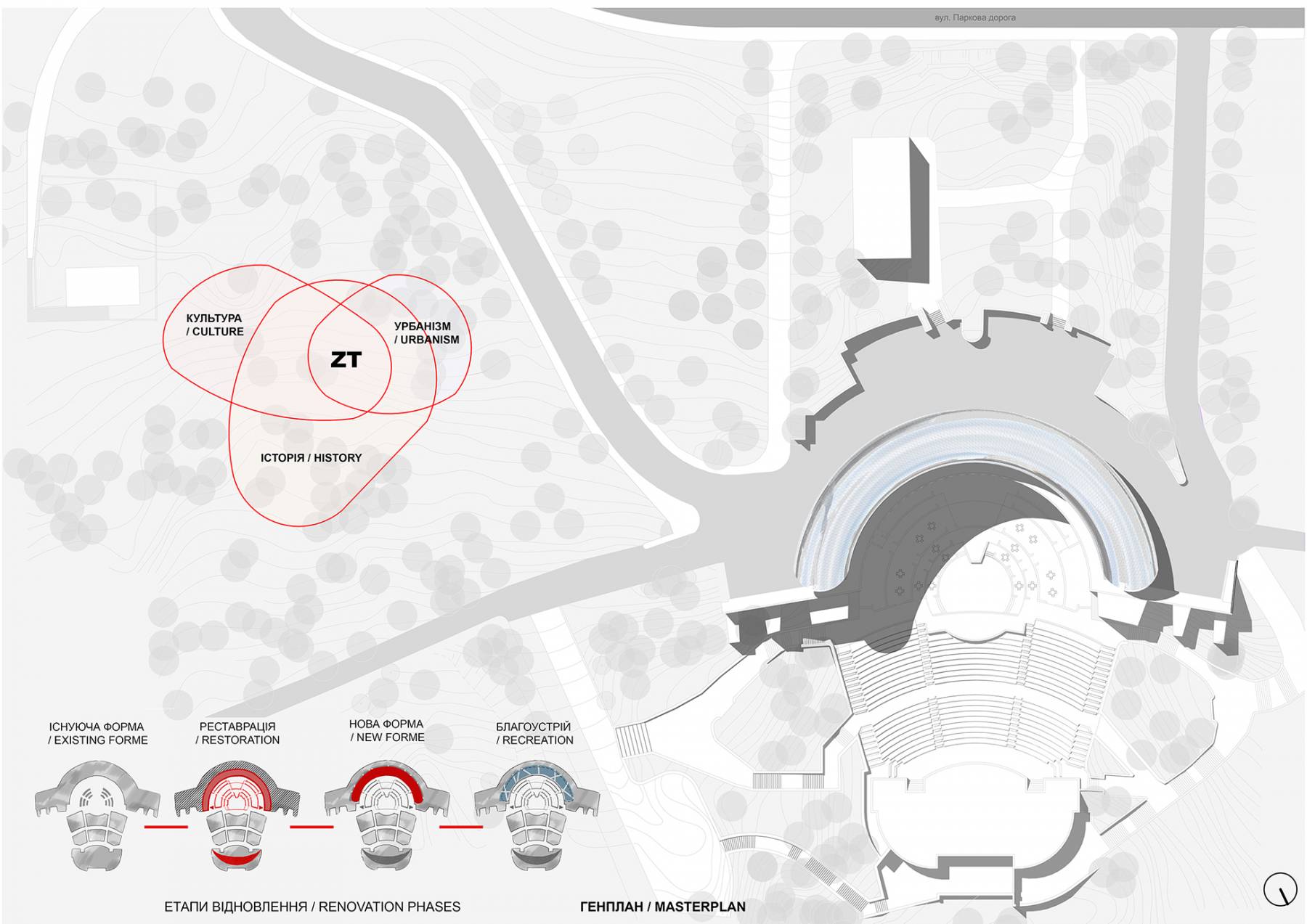 У самому Зеленому театрі проект передбачає реконструкцію сцени і місць для глядачів.