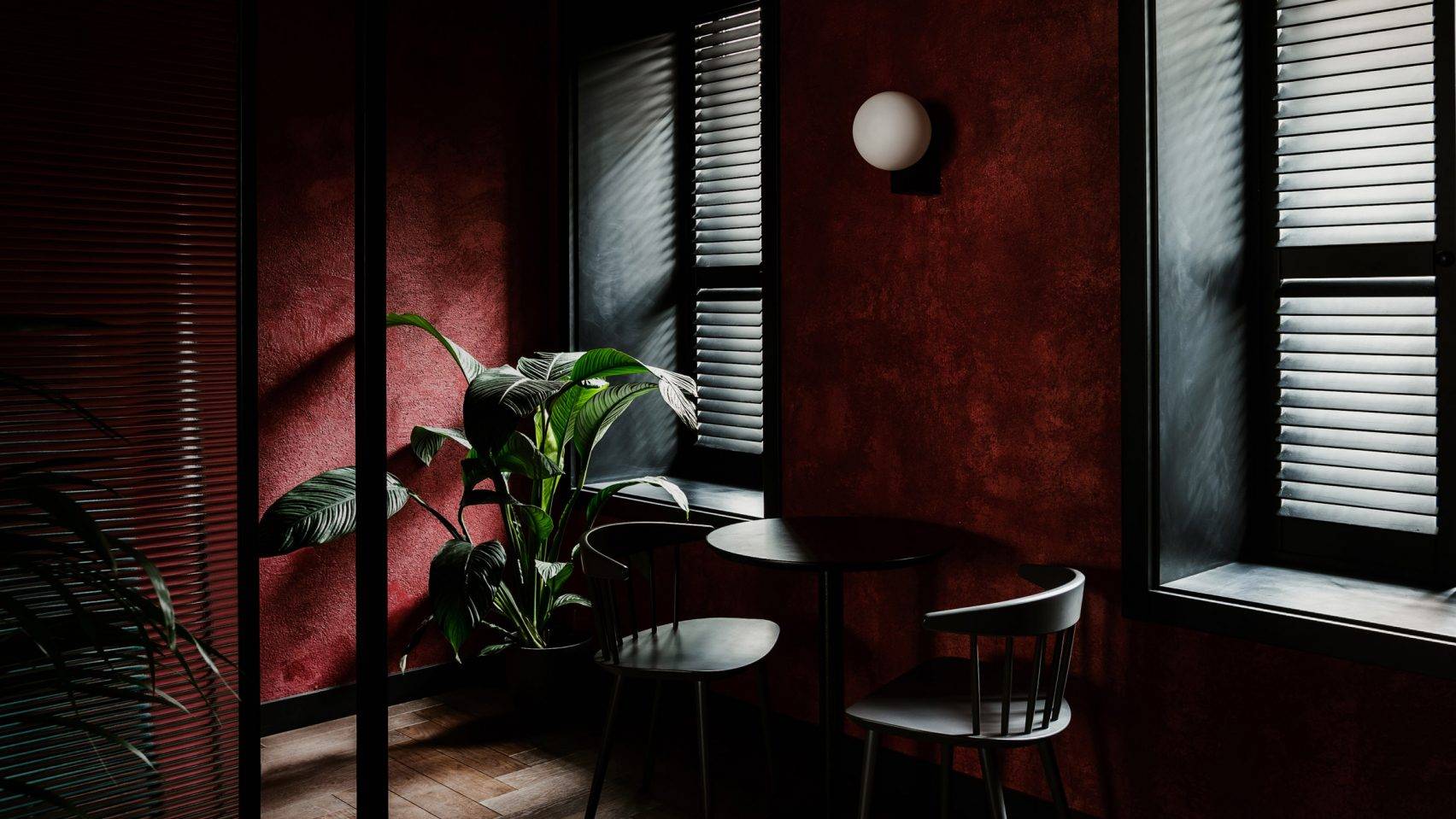 У другому приміщенні стіни пофарбували в криваво-червоний. На вікнах встановили чорні жалюзі, а зал розділили на зони панеллю з гофрованим склом. З меблів тут – чорні стільці та нефритово-зелений диван.
