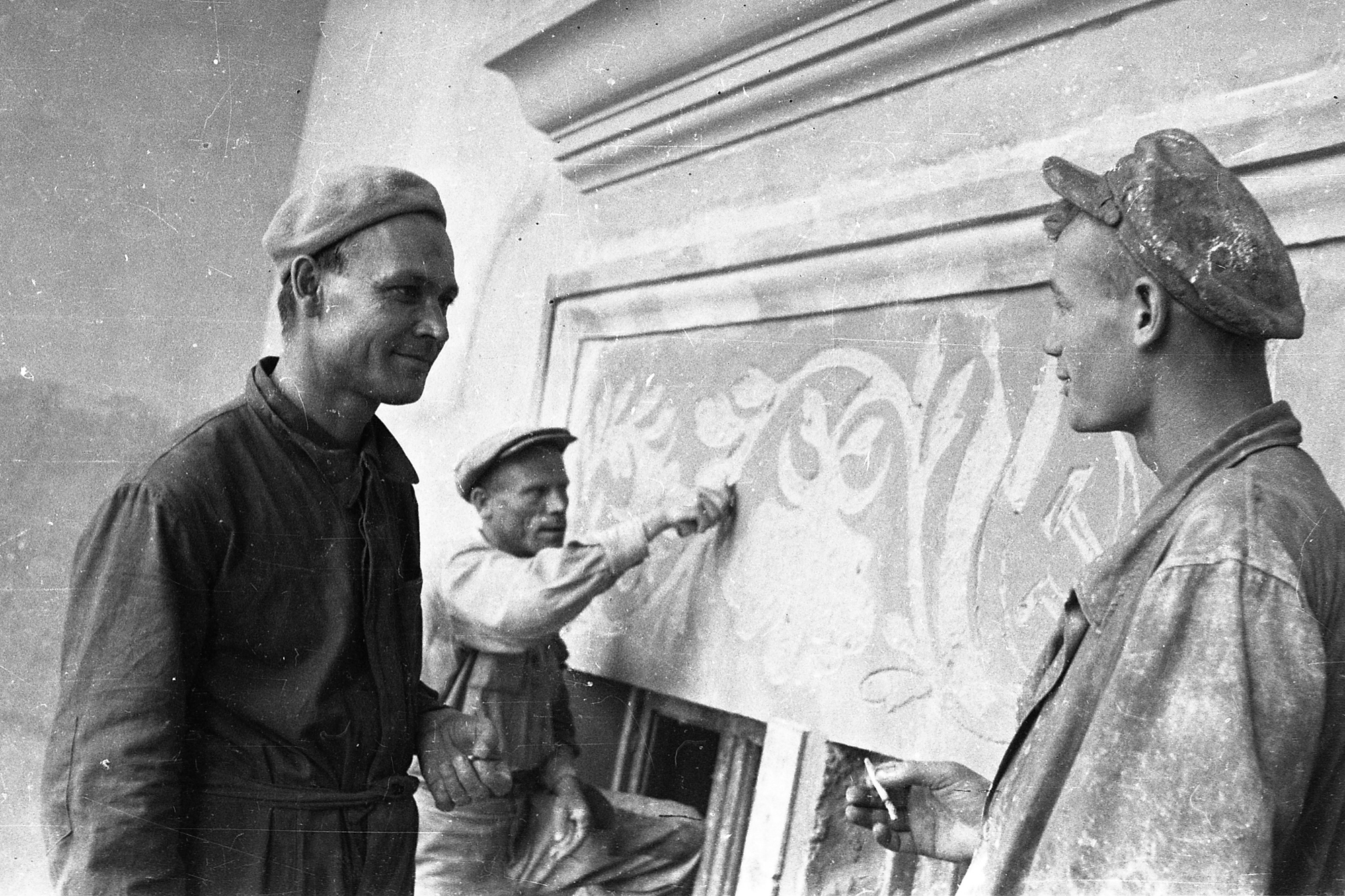 Працювали над вишиванками вночі. Жодного дерева ще не виросло, а це південь — спека неймовірна. Не встигнеш нанести цемент, як він уже висихає. Тому ще ввечері приходили штукатурниці, набивали рамки під панно і у кілька шарів накидали розчин. Близько п’ятої ранку, коли тільки світало, до роботи ставали художники. Вони швидко переносили намітки зі шаблону й починали різати. Це була тяжка праця, де помилка неприпустима, а час — обмежений. Стояти доводилось на лісах, майже впритул до стіни. А панно — величезне. Треба було весь час відходити, аби зрозуміти, чи правильно ріжеться орнамент, чи не порушується композиція.