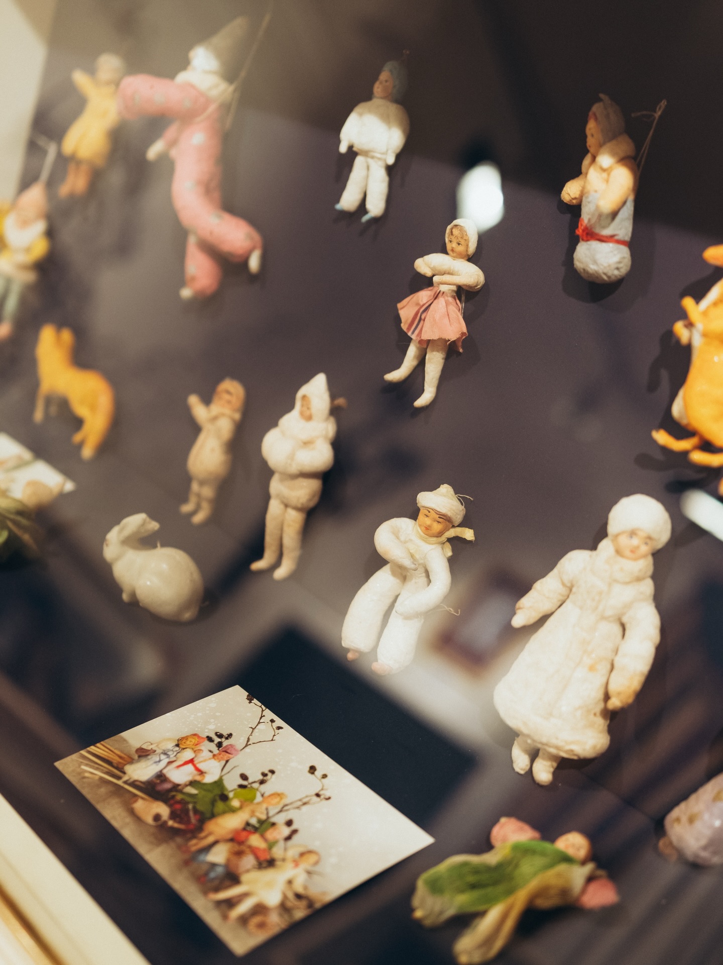 Тут можна побачити рідкісні предмети з приватних колекцій: ватяні фігури, паперові й фігурні скляні декорації, перші кульки зі складним виробничим процесом, а також прикраси в українських строях, які експортувалися за кордон.