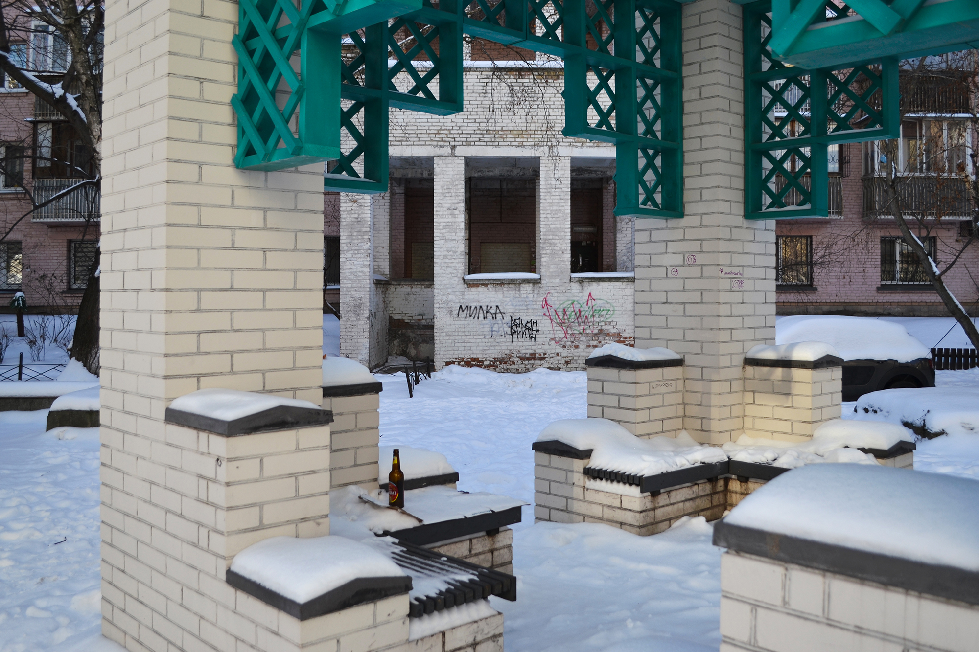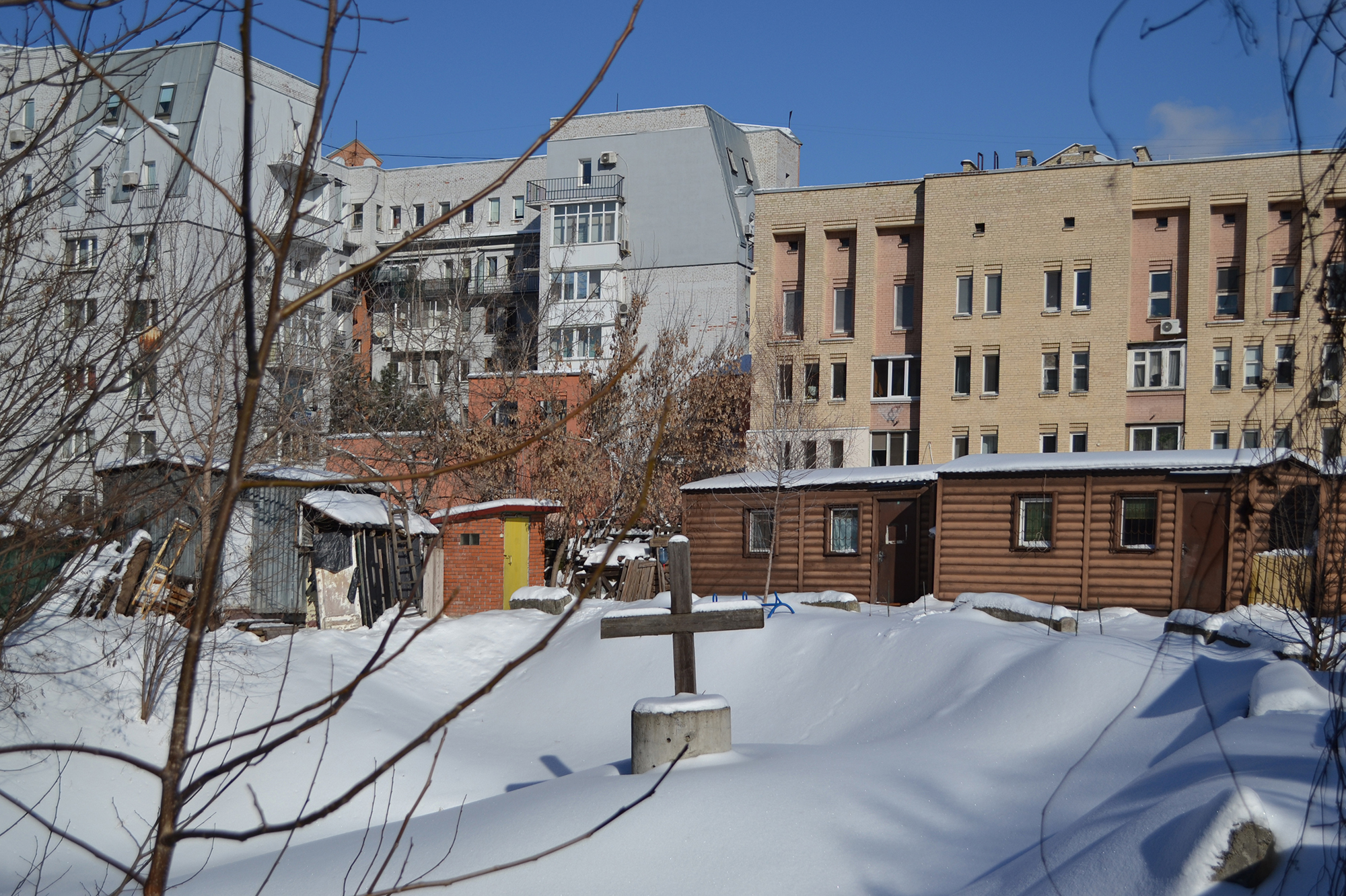 Посеред кварталу між Кирилівською, Костянтинівською, Оленівською та Юрківською є невелика дерев’яна церква. За нею — пустир із хрестом і залишки цегляної недобудови. Із двох запланованих дитячих садків побудували тільки один — у сусідньому кварталі. Тут, на місці пустиря, мав би бути другий.