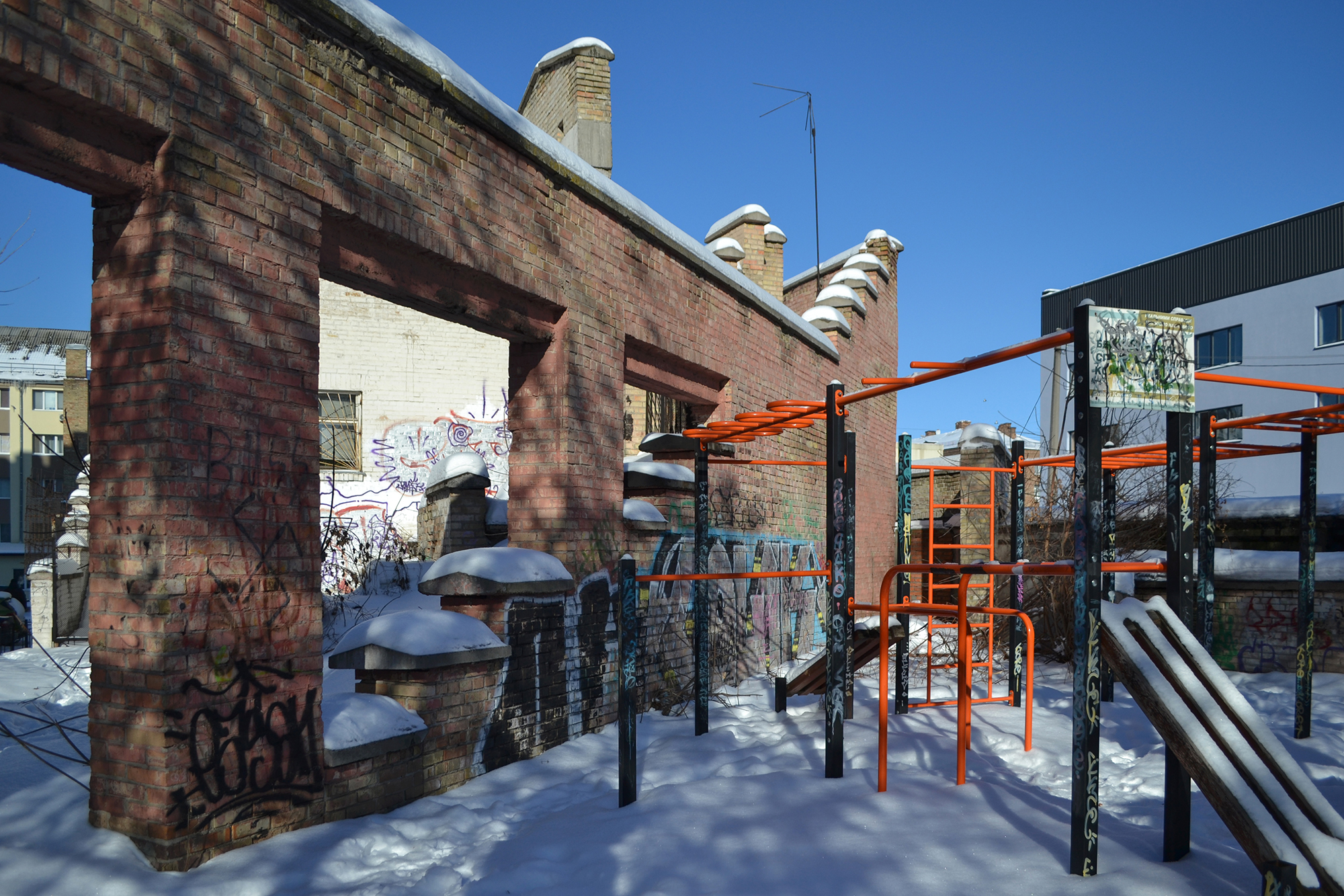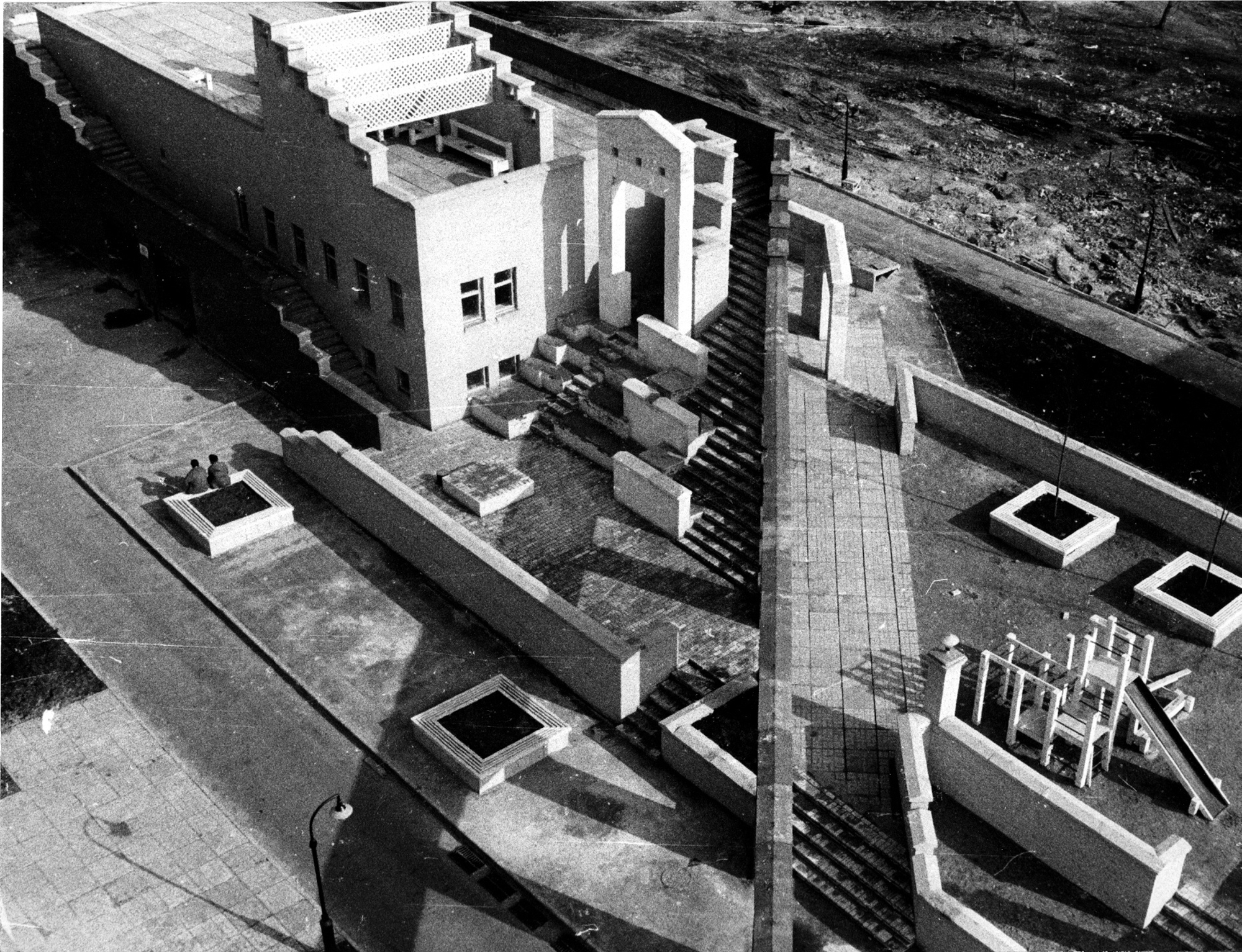 Схожа історія сталася ще у 1980-х. У кварталі між Костянтинівською, Межигірською, Юрківською та Оболонською архітектори інтегрували будівлю бойлерної в громадський простір: на її основі створили багаторівневі майданчики для ігор і відпочинку. На одному рівні встановили дерев’яні літні меблі та перголи для витких рослин; поруч облаштували простір для проведення імпровізованих вистав, зібрань і свят.