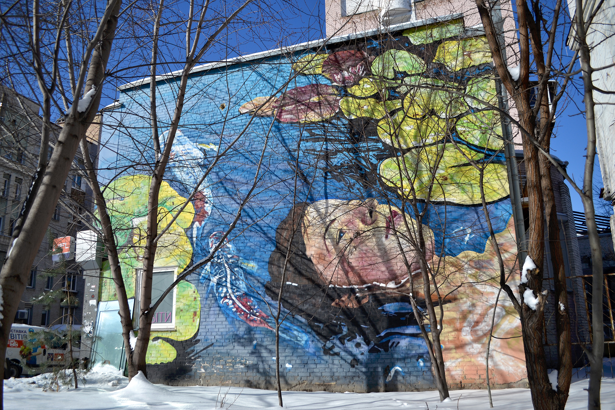 Навпроти «Щекавиці» у 2016 році, під час мурального буму, з’явився розпис із зображенням дівчини, яка лежить на воді. Юрій Шалацький розповів пов’язану з цим твором історію. Кожен із будинків чотирьох кварталів проєктував окремий архітектор команди. Рожевий будинок на Костянтинівській створила Тетяна Лазаренко — донька архітекторки Наталії Чмутіної. Життя Тетяни трагічно обірвалося: вона втопилася.