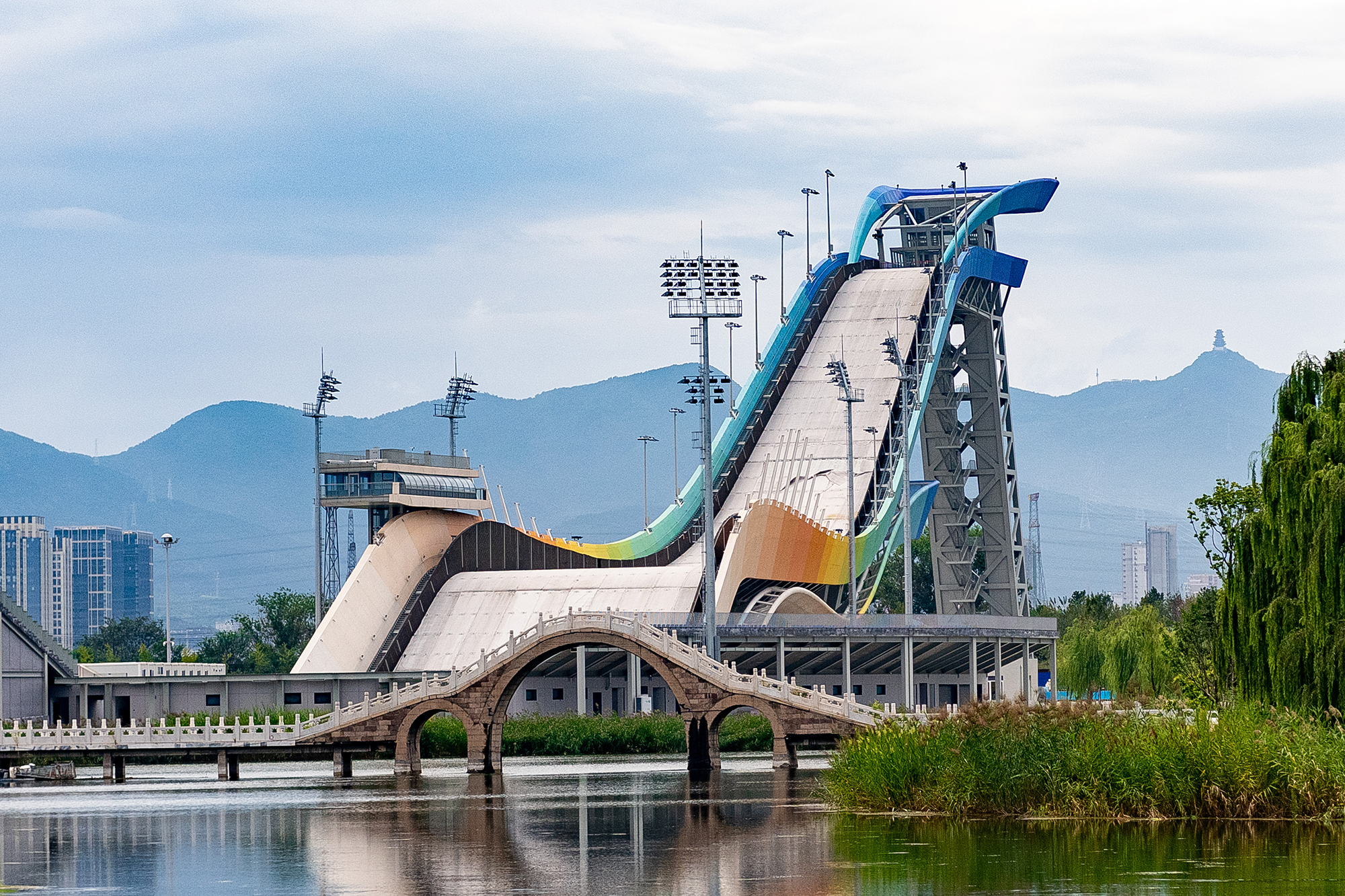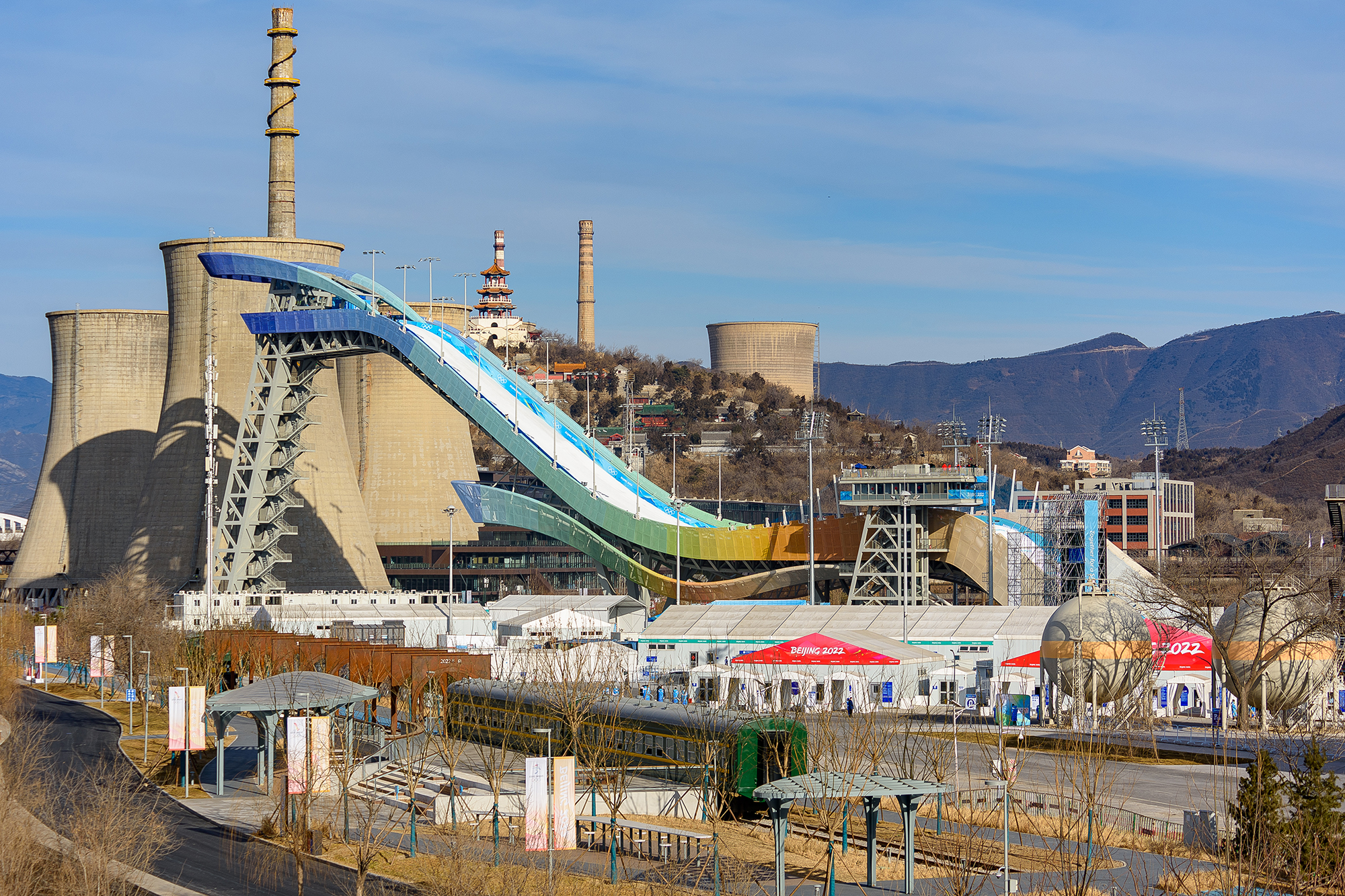 2011 року в промисловому районі Пекіна зупинили сталеливарний завод Shougang Group. На території лишилися гігантські градирні та закинута промзона. Споруди могли знести, але попереду були Зимові Олімпійські ігри 2022 року — і від цієї ідеї відмовилися. Натомість колишню насосну станцію перетворили на вхідну групу й адміністративний блок, а на дахах цехів поряд із градирнями побудували лижний трамплін — найвпізнаваніший об’єкт Олімпіади.