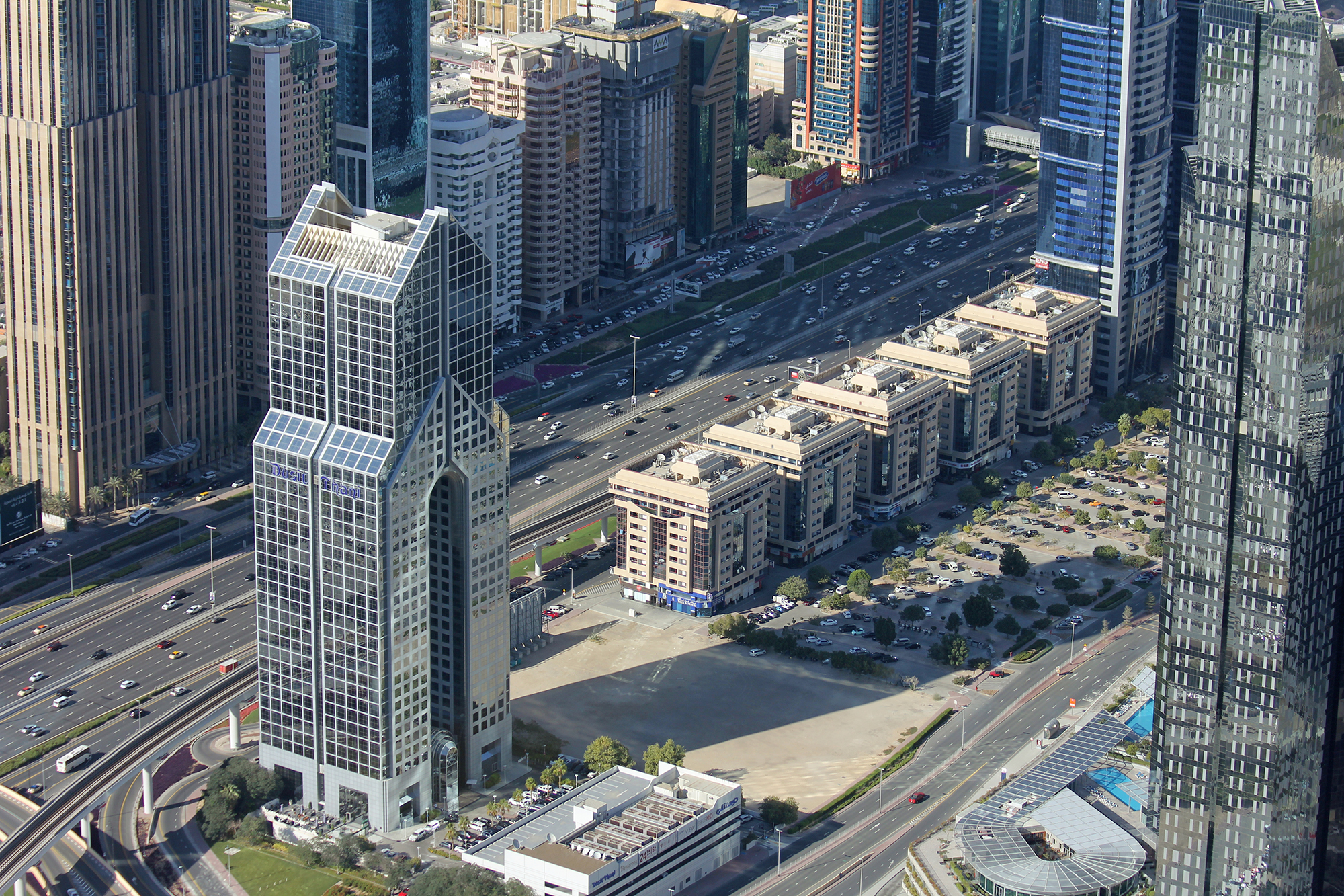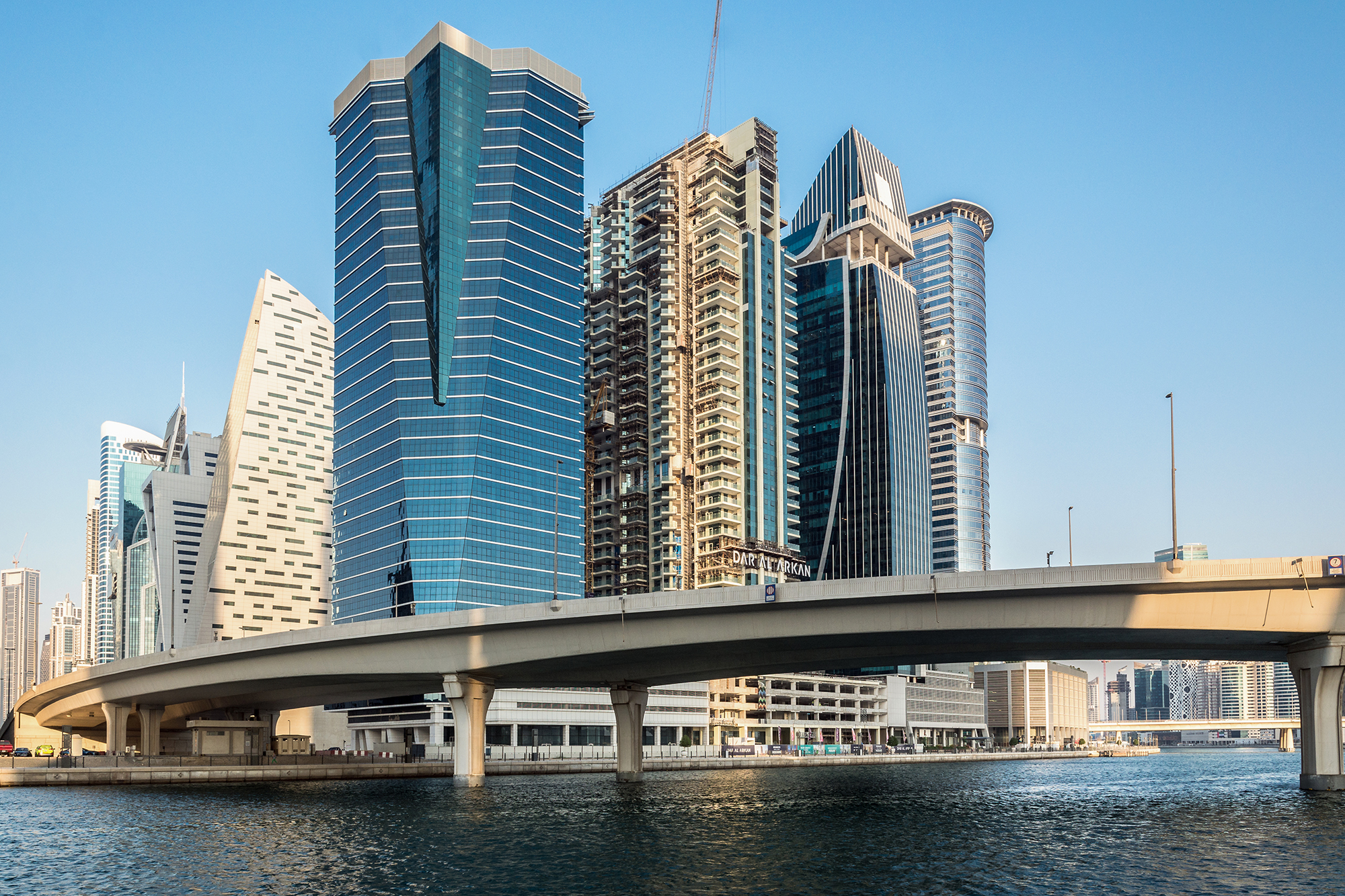 Забудова тут від початку була щільна, висотна та орієнтована на масштабування. Місто швидко розросталося вздовж узбережжя та автомагістралі шосе шейха Заїда — головної транспортної артерії, що поєднує його зі столицею ОАЕ Абу-Дабі. Саме ця вісь визначила напрям розвитку: замість класичного колоподібного міста — витягнута вздовж траси й берега смуга, до якої послідовно додаються нові квартали.
