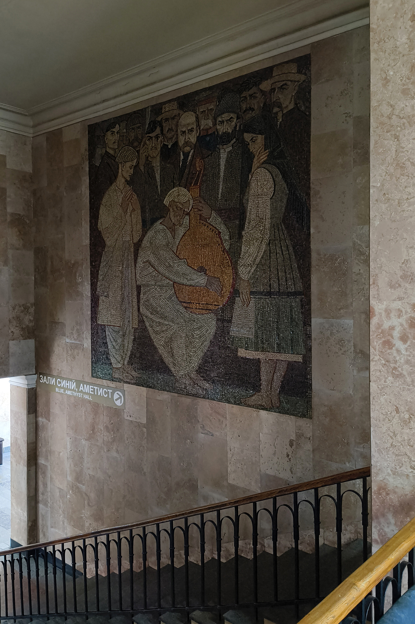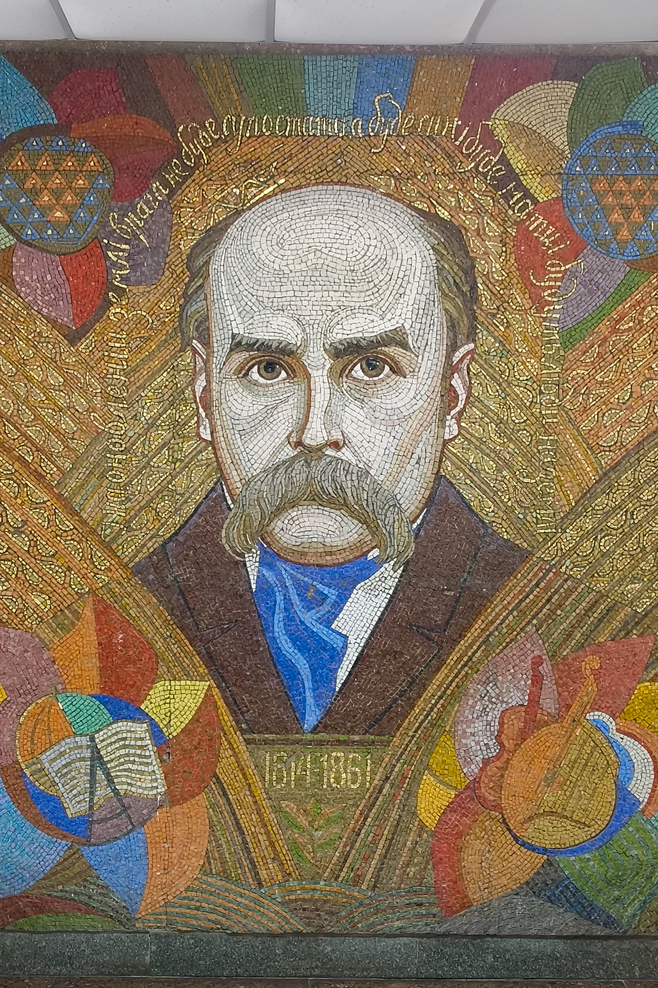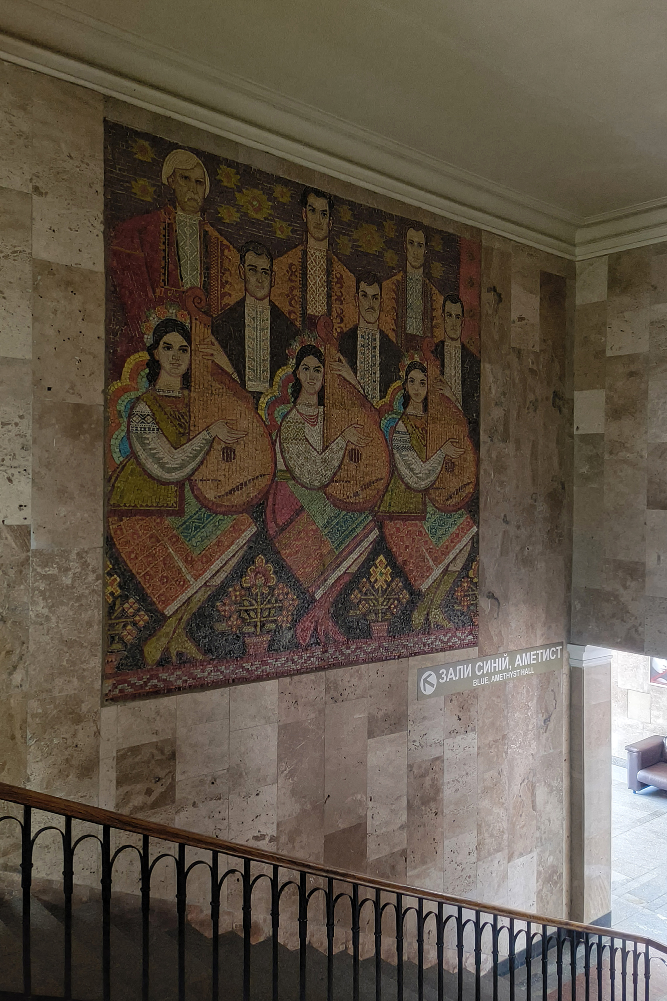 У вестибюлі — великий портрет Шевченка, викладений смальтою. Його обрамлюють колосся і квіти, а навколо — напис із позолотою: «І на оновленій землі врага не буде, супостата, а буде син, і буде мати, і будуть люде на землі». Над сходами — диптих «Кобзар». Ці мозаїки спочатку створили для музею Шевченка, але після його реконструкції демонтували й перенесли до кінотеатру, де вони зберігаються донині.