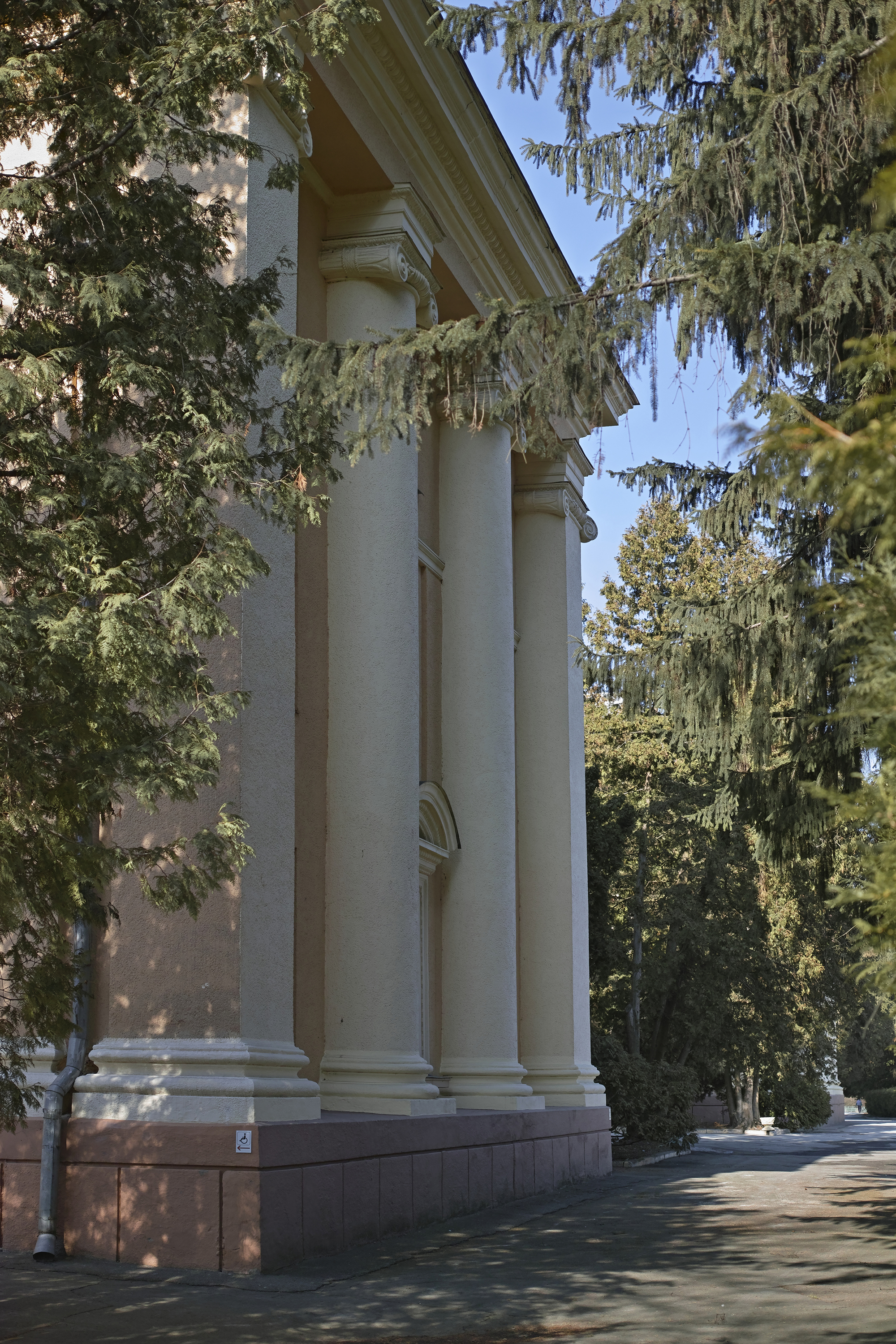 Зовні ця двоповерхова будівля має лаконічний і майже непримітний вигляд. Сьогодні фасад утеплений і пофарбований у неприємний болотистий колір, раніше він був облицьований простою бежевою керамічною плиткою. Але найцікавіше — всередині: тут збереглися одразу три мозаїчні панно видатного подружжя монументалістів Степана Кириченка і Надії Клейн.
