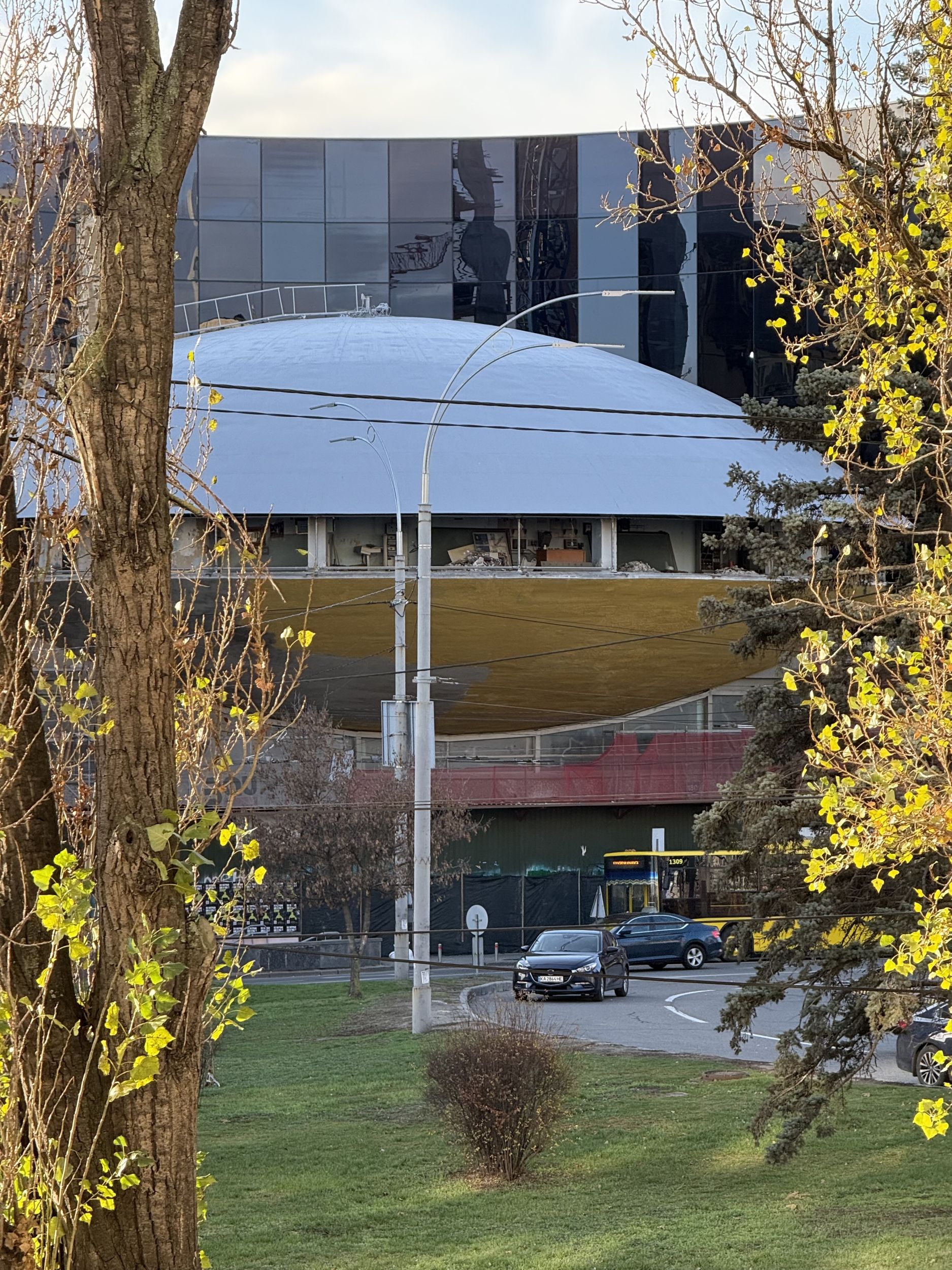 У Києві в будівлі Українського інституту науково-технічної та економічної інформації, відомій як «Літаюча тарілка», демонтували вікна.