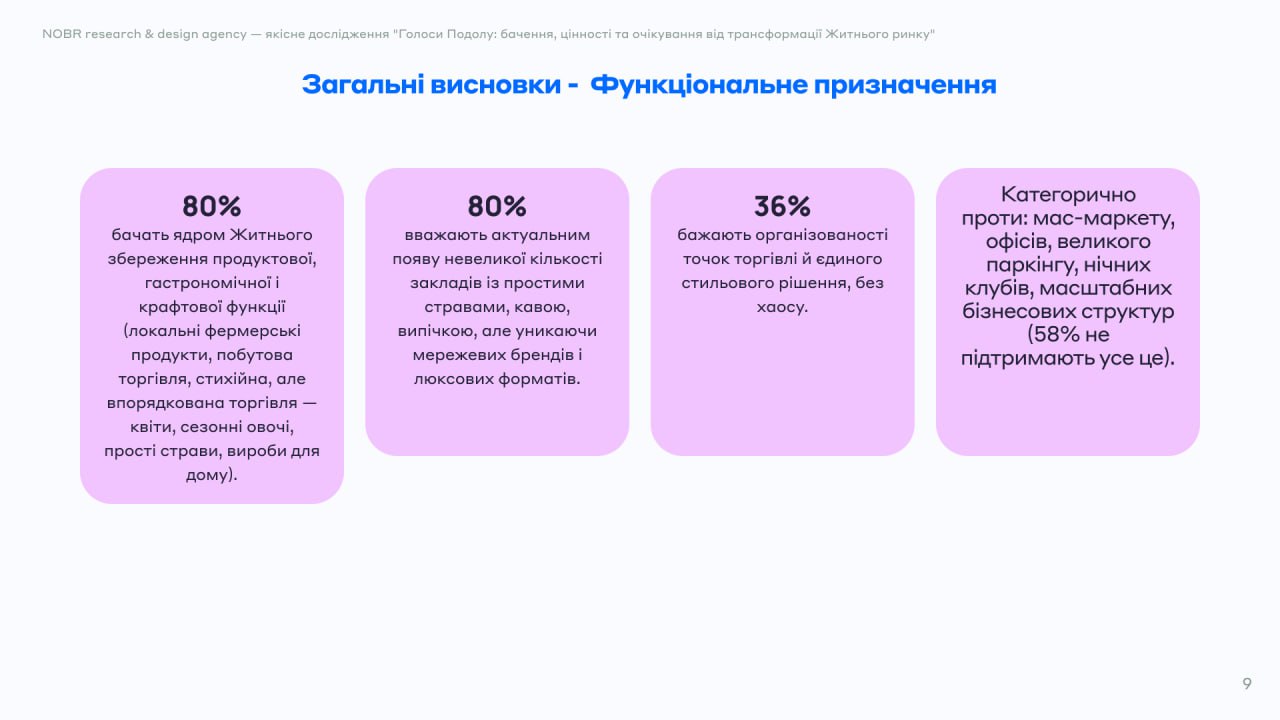 Зокрема, 86 % містян виступають за оновлення ринку без радикальної перебудови, водночас 80 % вважають, що Житній має залишитися ринком із локальними фермерськими продуктами та побутовою торгівлею, як зараз.