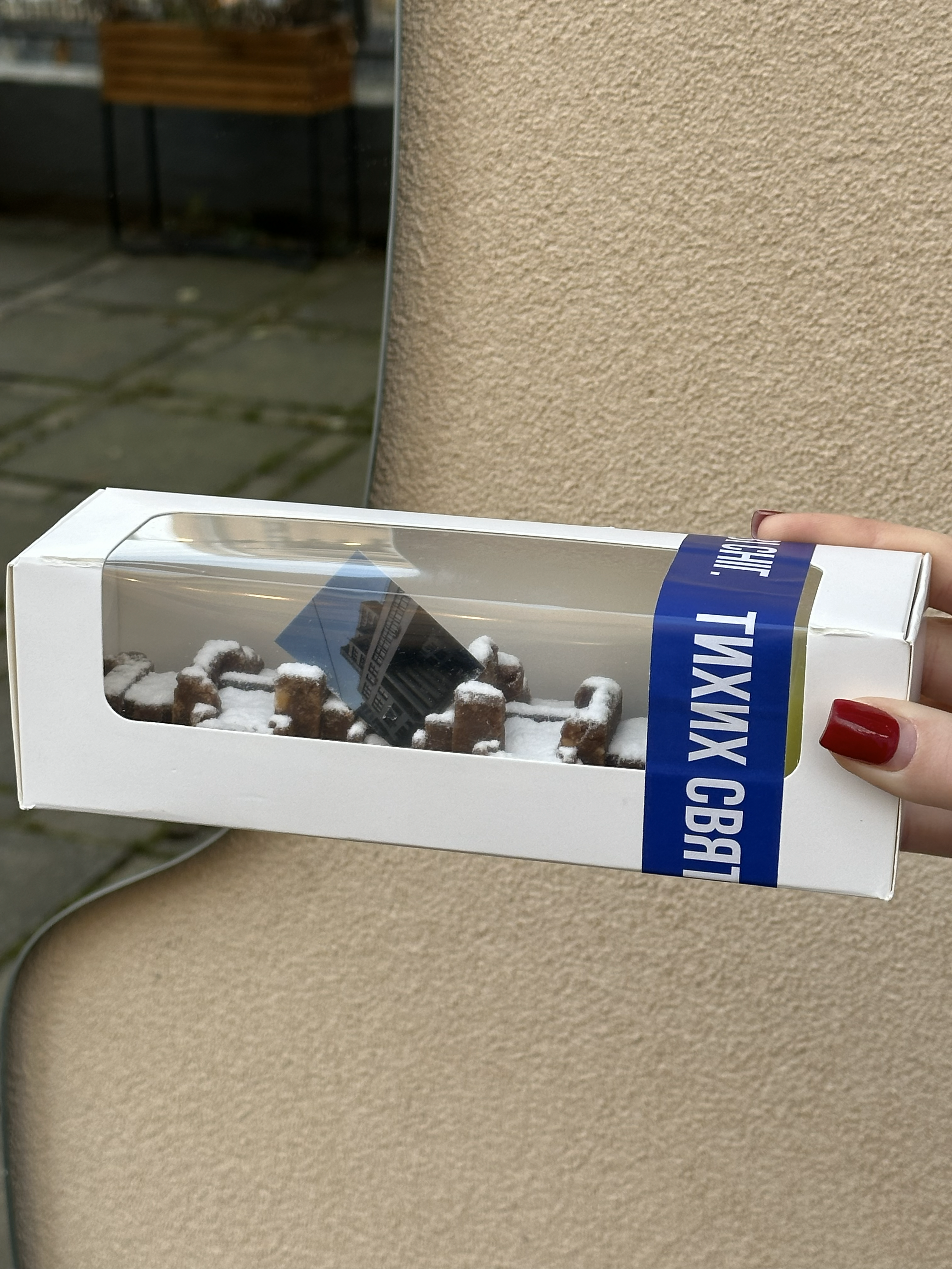 Разом із десертом гостям пропонують заламіновану фотографію Держпрому авторства харків’янки Софії Панасюк. На зображенні — будівля з вибитими вікнами та пошкодженими вітражами.