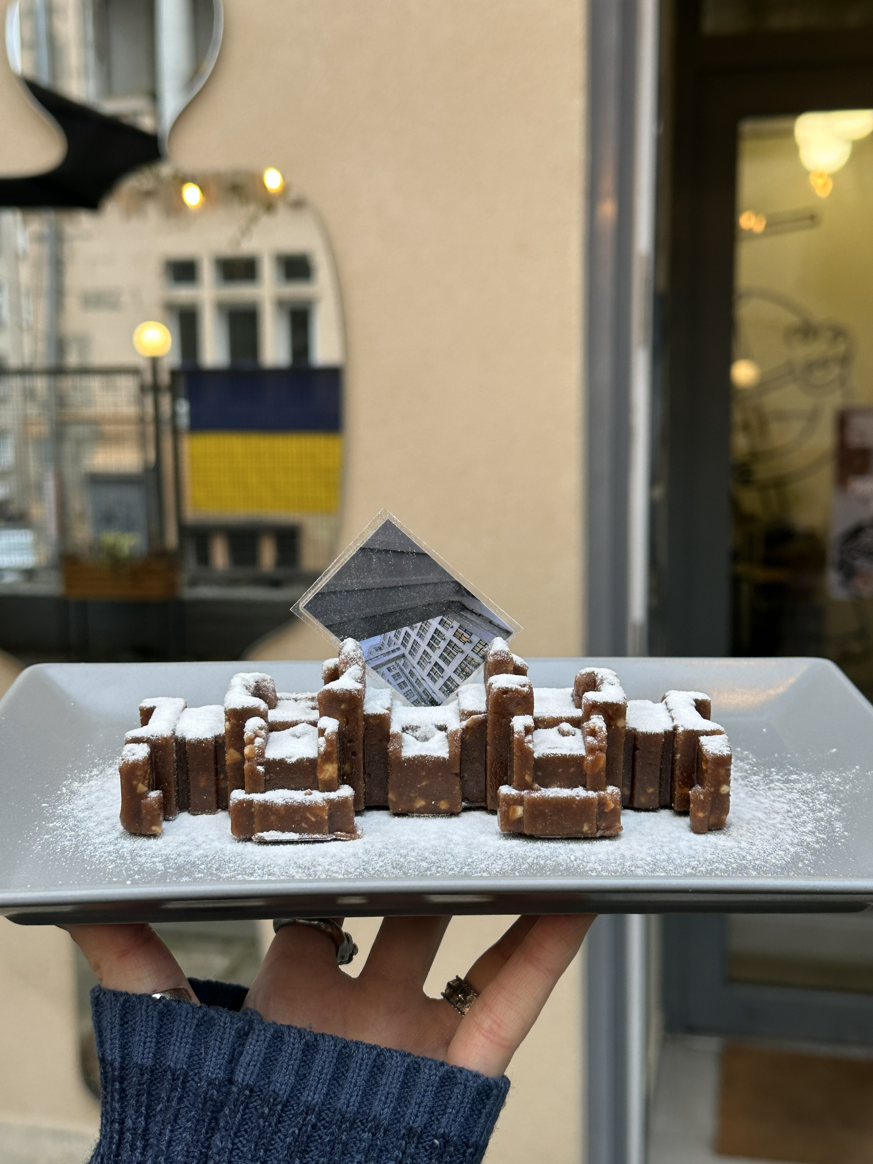Львівське азійське кафе «Третє Місце» представило десерт у формі засніженої будівлі харківського Держпрому — однієї з ключових архітектурних пам’яток міста.