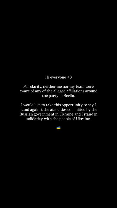 «Для ясності: ні я, ні моя команда не знали про будь-які ймовірні зв’язки навколо вечірки в Берліні. Хочу скористатися нагодою, щоб сказати: я проти звірств, скоєних російською владою в Україні, і солідарна з народом України», — написала артистка у сторіс.