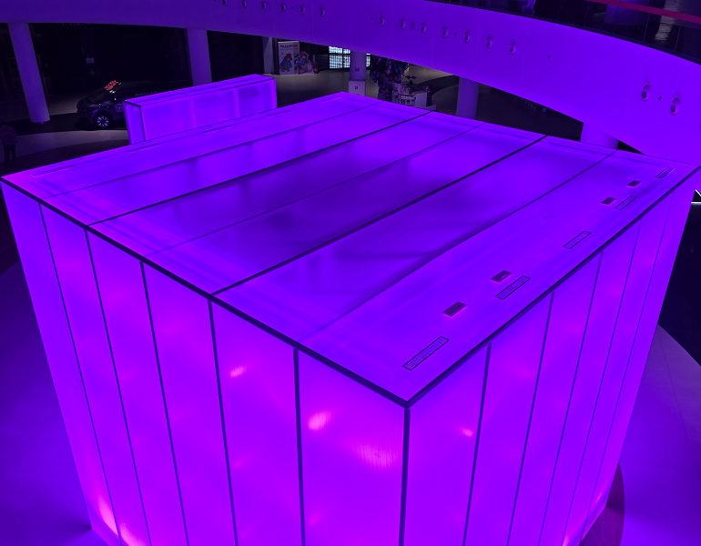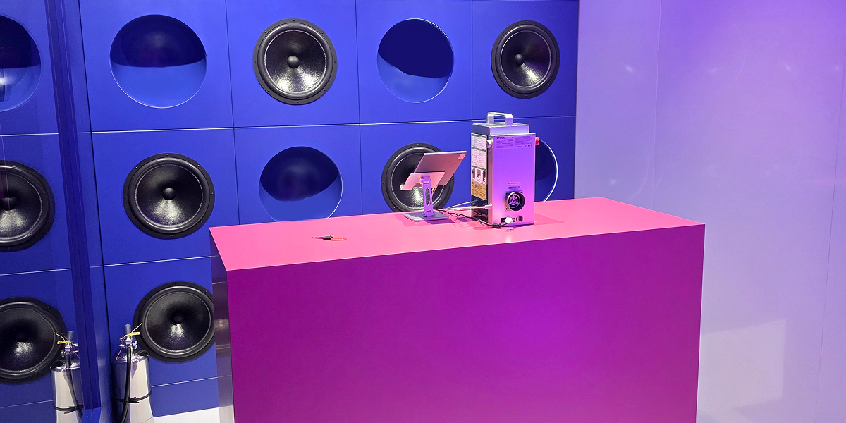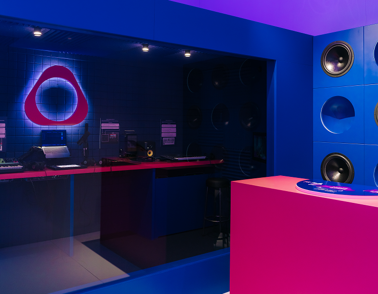 Простір реалізований у формі напівпрозорого куба розміром 6х6х6 метрів. Дизайн натхненний естетикою синт-попу 80-х: конструкція має неонову фіолетову підсвітку — на честь нового кольору Electric Purple у лінійці бренду. А внутрішнє зонування стилізоване під звуковий процесор.