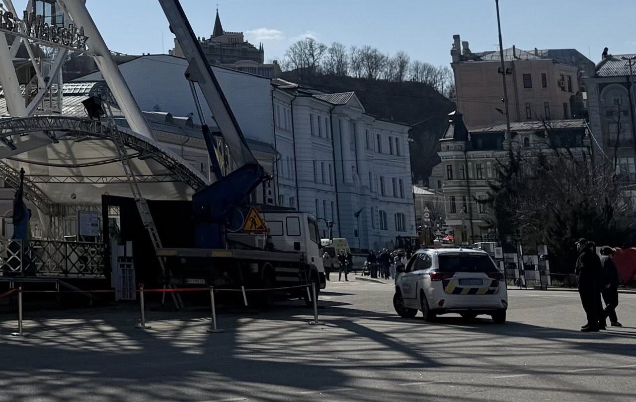 На Контрактовій площі Києва 20 березня розпочали демонтаж оглядового колеса. Роботи виконують згідно з ухвалою суду під наглядом співробітників Національної поліції України, повідомив пам’яткоохоронець Дмитро Перов.