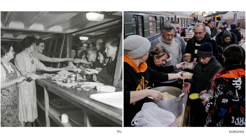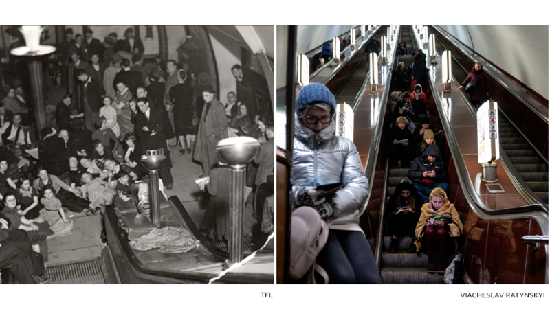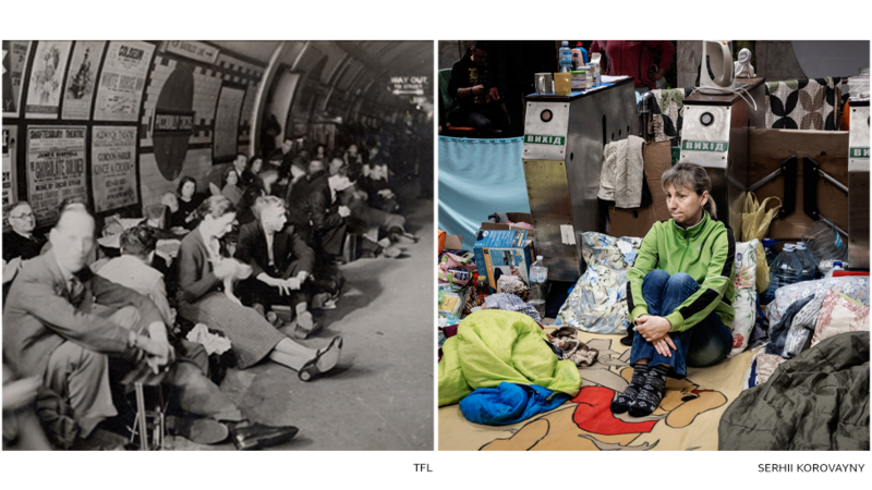 На виставці показані 70 фото з архівів, на яких лондонці ховаються від бомбардувань Люфтваффе у 1940-х роках, та сучасні фотографії мешканців України, змушених спускатися в метро під час російських атак.