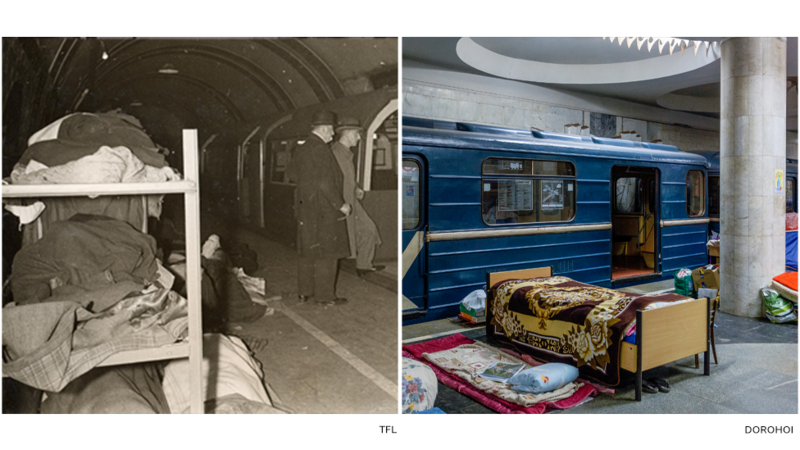 У Лондоні в 1940-х роках це стало настільки звичайним явищем, що було введено спеціальні квитки для входу до метро з метою укриття від бомбардувань. На платформах встановлювали багатоповерхові ліжка, видавали їжу, а інколи організовували бібліотеки та музичні виступи. Жителям Києва та Харкова у 2022 році також довелося адаптувати платформи метро для створення домашнього затишку та проведення концертів.