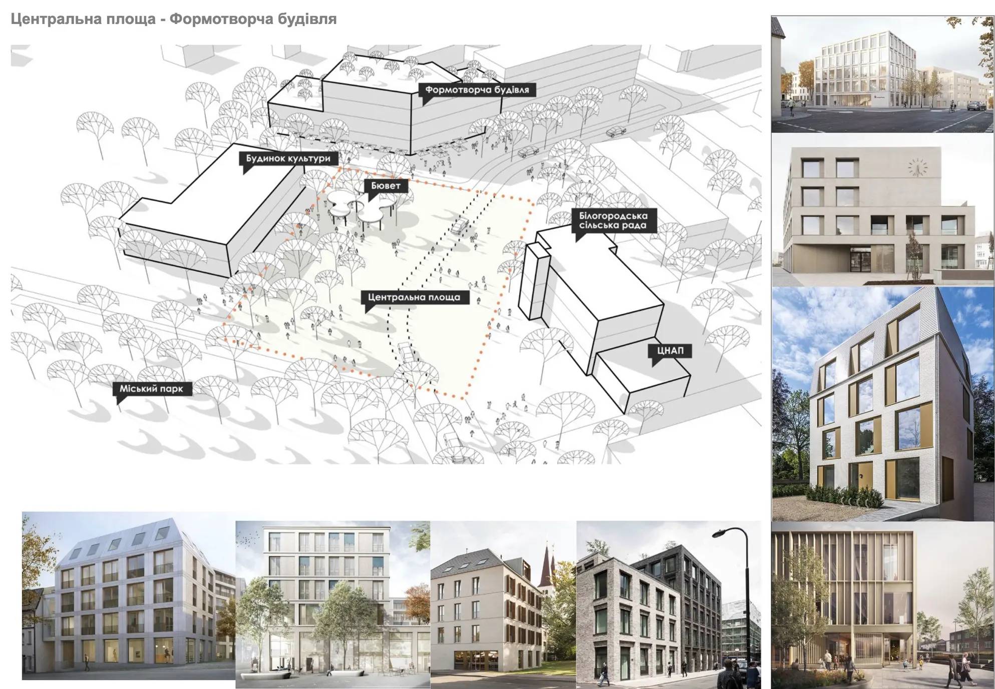 Пропозиції щодо ущільнення забудови в центрі Білогородки включають житловий квартал, торговельний центр і “формотворчу будівлю” біля центральної площі.