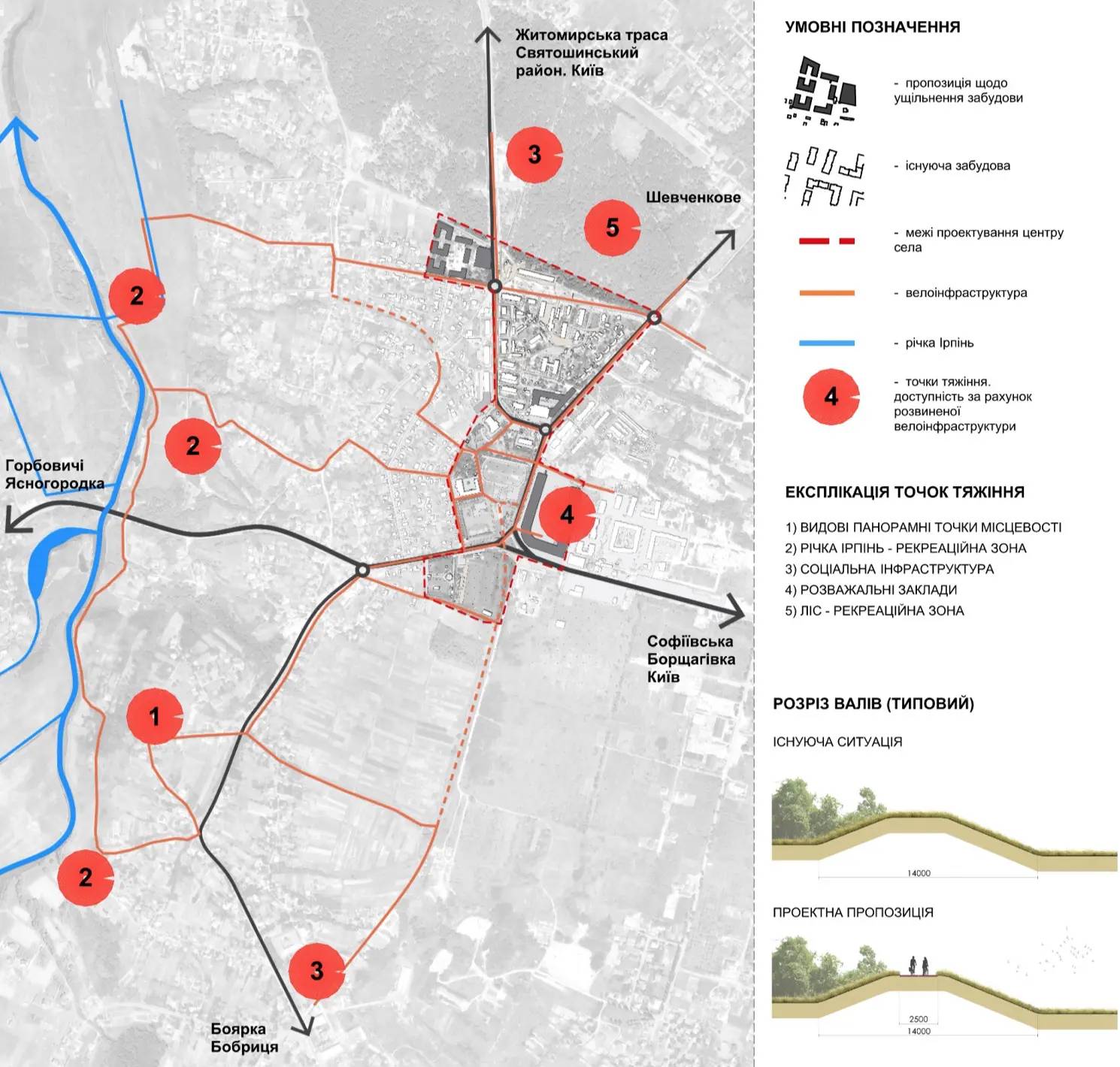 Концепція передбачає також створення веломережі, яка сполучить всі цікавинки села, такі як набережна річки Ірпінь і залишки середньовічних фортифікацій.