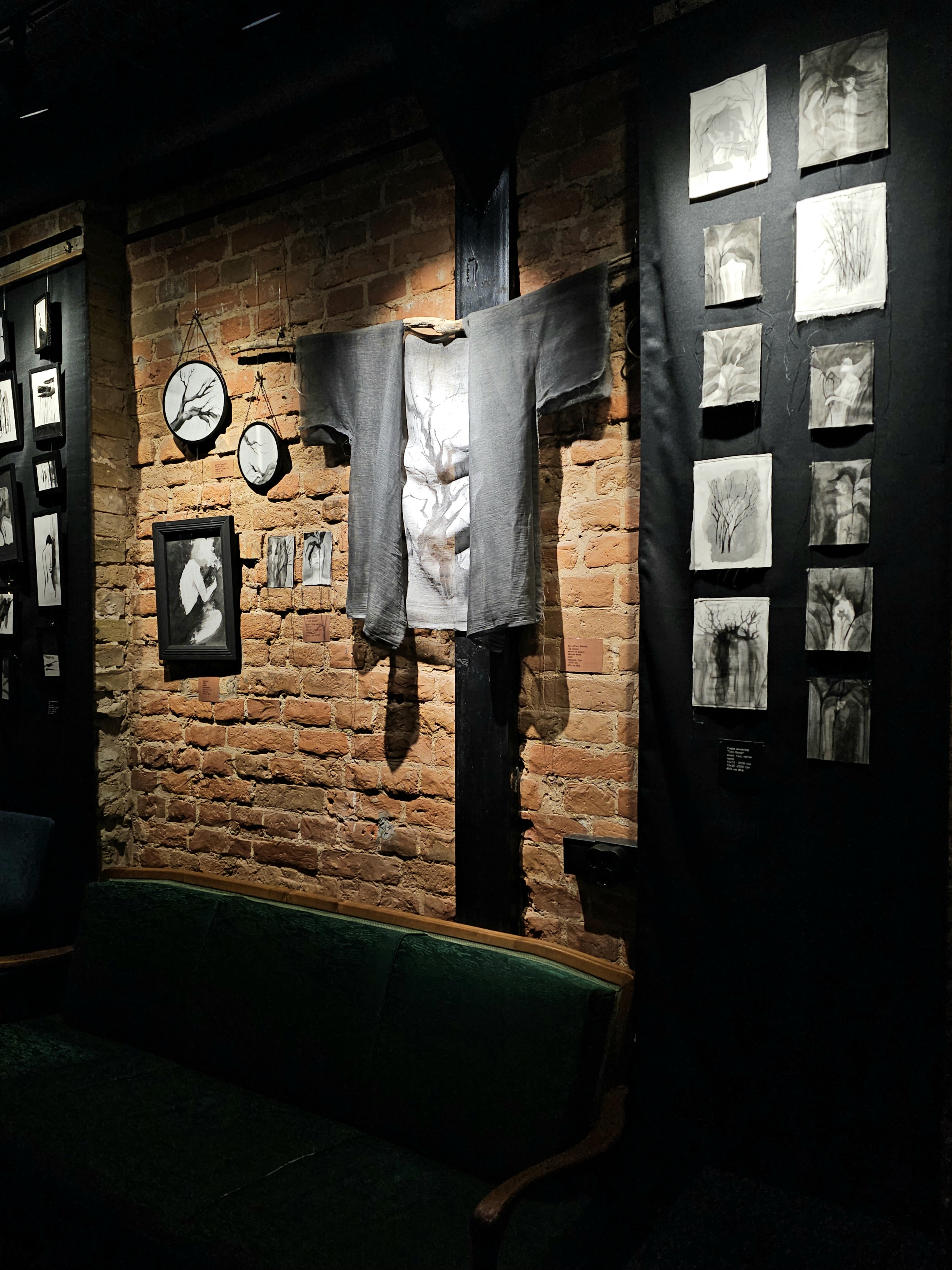 Виставка Жені Коган «Між Кроками» досліджує проживання кризи як природного етапу життя через текстиль, графіку та інсталяцію. В експозиції — роботи з серій «Неминучість», «Що для тебе синій», «Кола на воді» та інші. Матеріали й техніки, за словами мисткині, працюють як спосіб говорити про «внутрішні суперечності та тонкі особисті конфлікти».