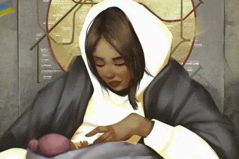 Серед представлених творів є й робота Марини Соломенникової «Київська мадонна». Уперше мисткиня побачила фото жінки з дитиною, яка ховається у київському метро від російських ракет у стрічці соцмереж, а вже потім у новинах. Пізніше вдалося з’ясувати й автора оригінальної світлини – ним виявився угорський фотожурналіст Андраш Фьольдеш.