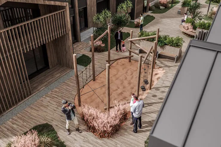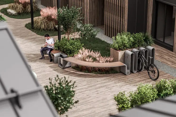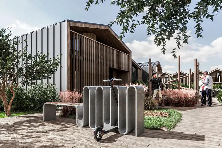 На території містечка пропонують встановити вуличні меблі та підзарядки для мобільного транспорту, а також провести озеленення, використовуючи спеціальні модулі – швидкозбірні конструкції для вирощування різних культур.