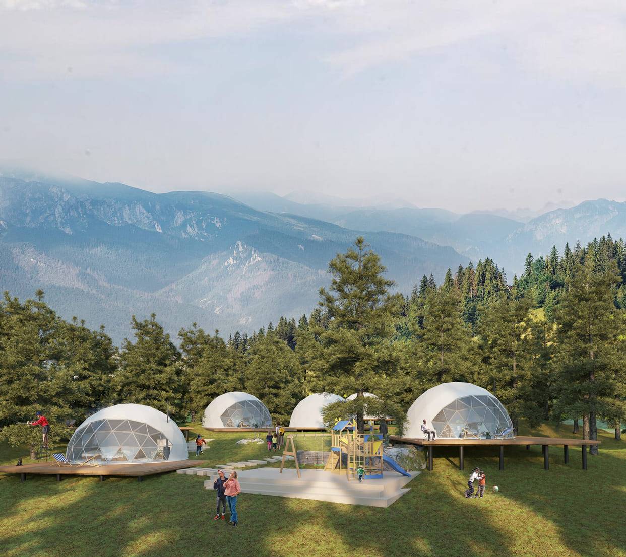Для будівництва центрів використовуватимуть геодезичні куполи. Такі будинки не втрачають міцності при пошкодженні до 30% площі, не потребують фундаменту та мають вільне планування через відсутність колон.