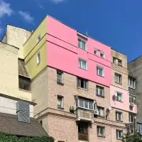 На Подолі у модерністському кварталі обшили фасад будинку рожево-жовтим пінопластом