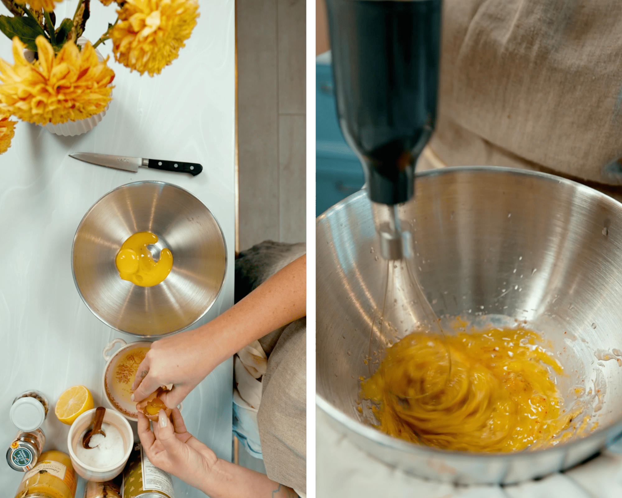 2. Соус — жовтки, лимонний сік, гірчицю, сіль і перець — збити блендером.