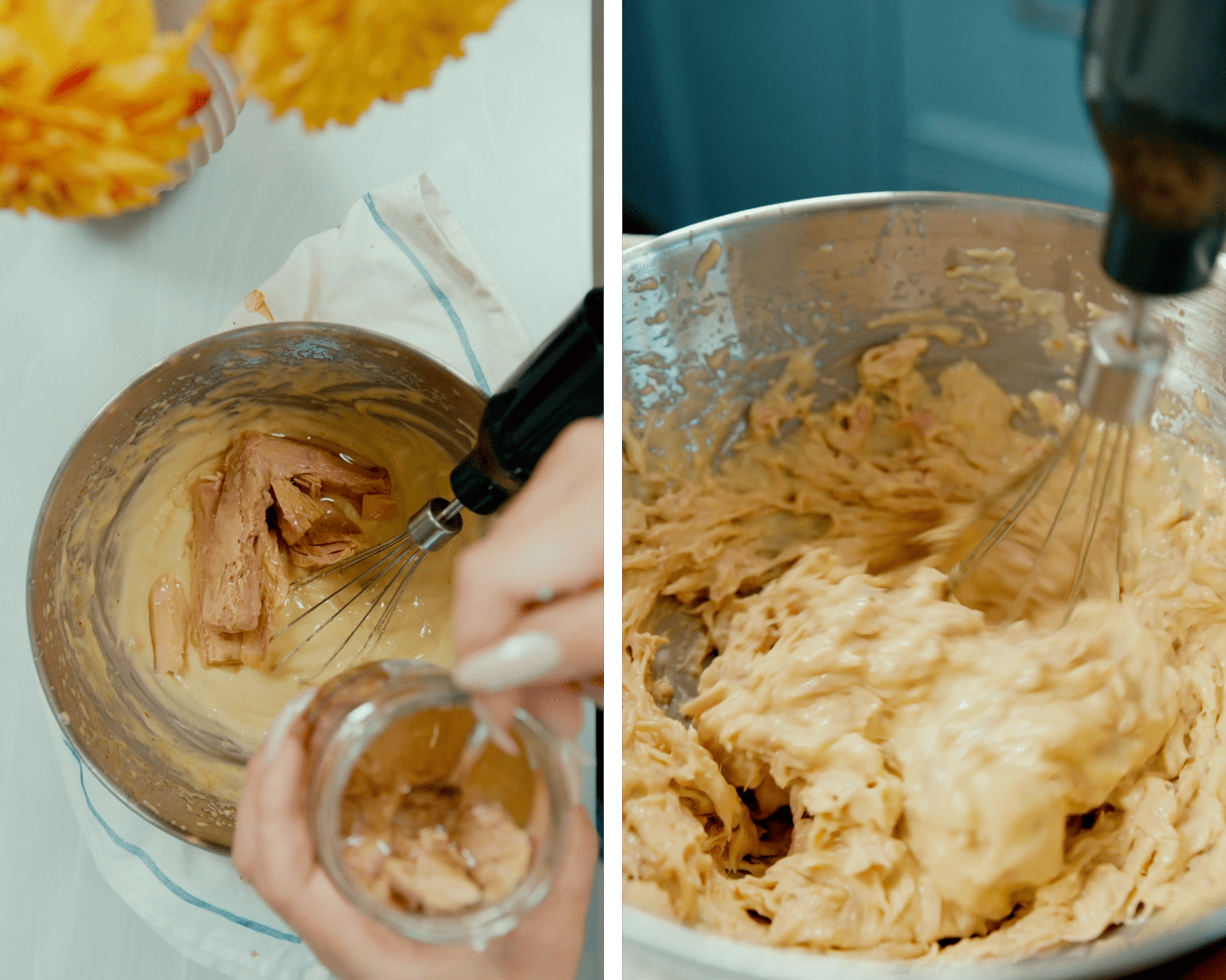 4. Додати тунець і трохи збити — до ніжної, оксамитової текстури. Долити вершки, перемішати.