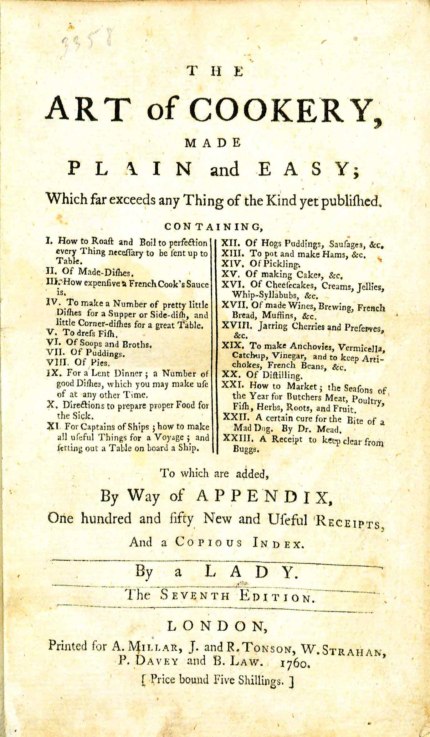 У XVIII столітті англійська письменниця Ганна Гласс написала кулінарний бестселер The Art of Cookery Made Plain and Easy («Мистецтво кулінарії, написане легко та просто»). У цій книжці вона наводить схожий рецепт: