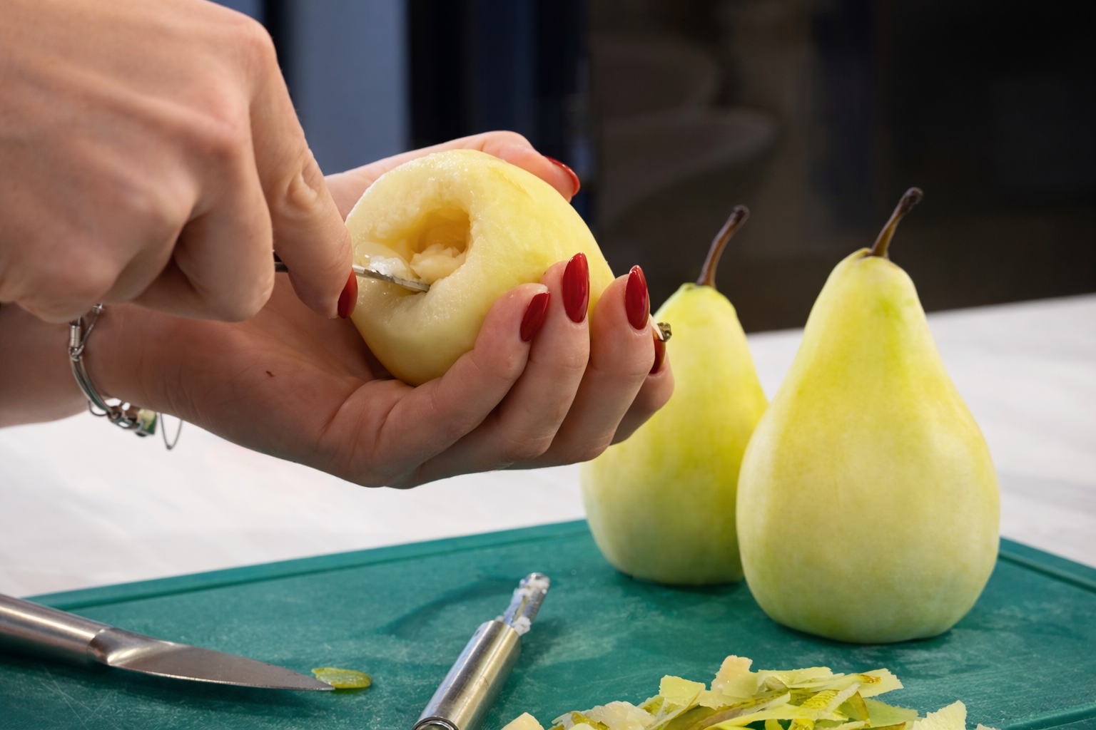 1. Очистити груші від шкірки, хвостик залишити. За бажанням обережно вичистити серцевину.