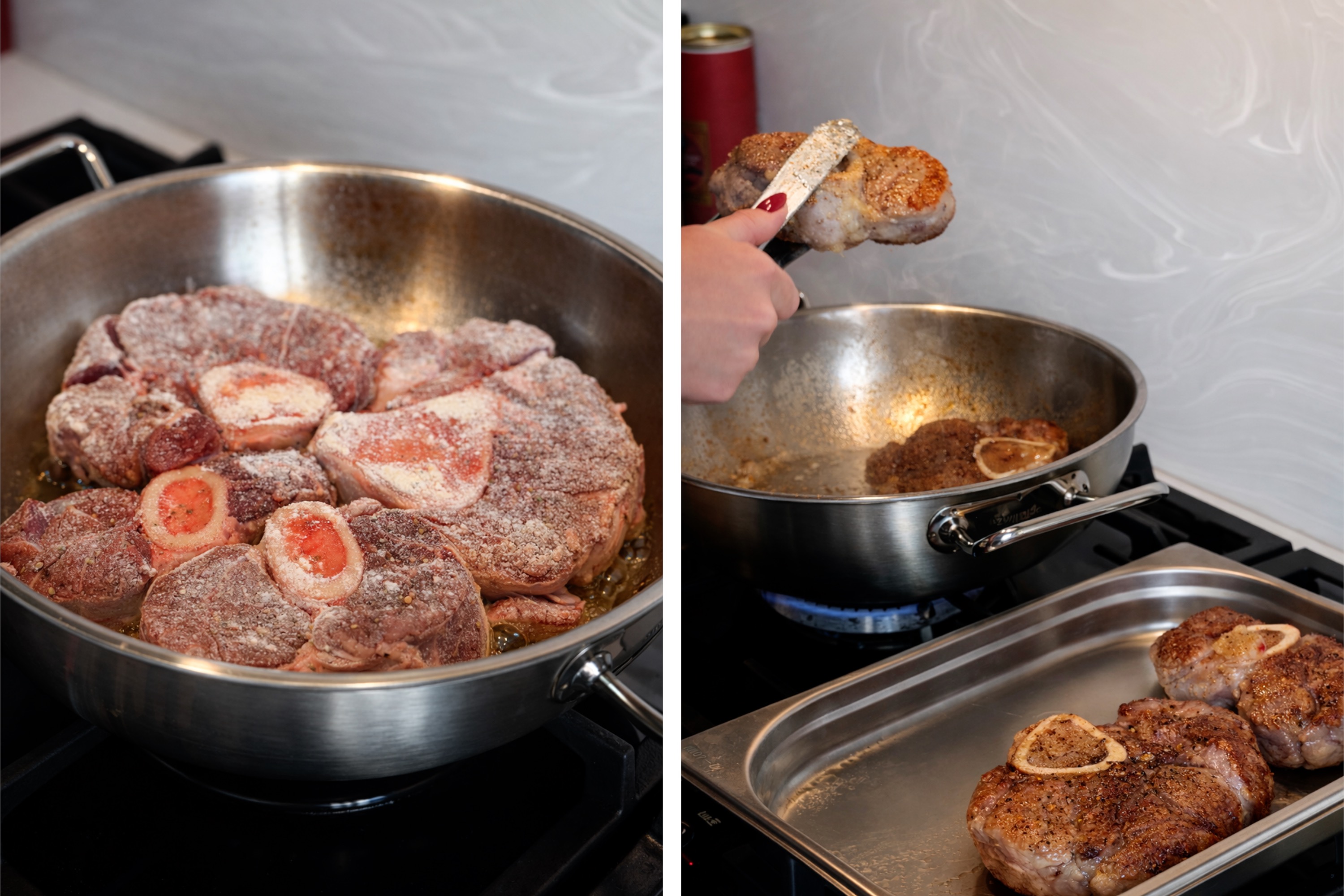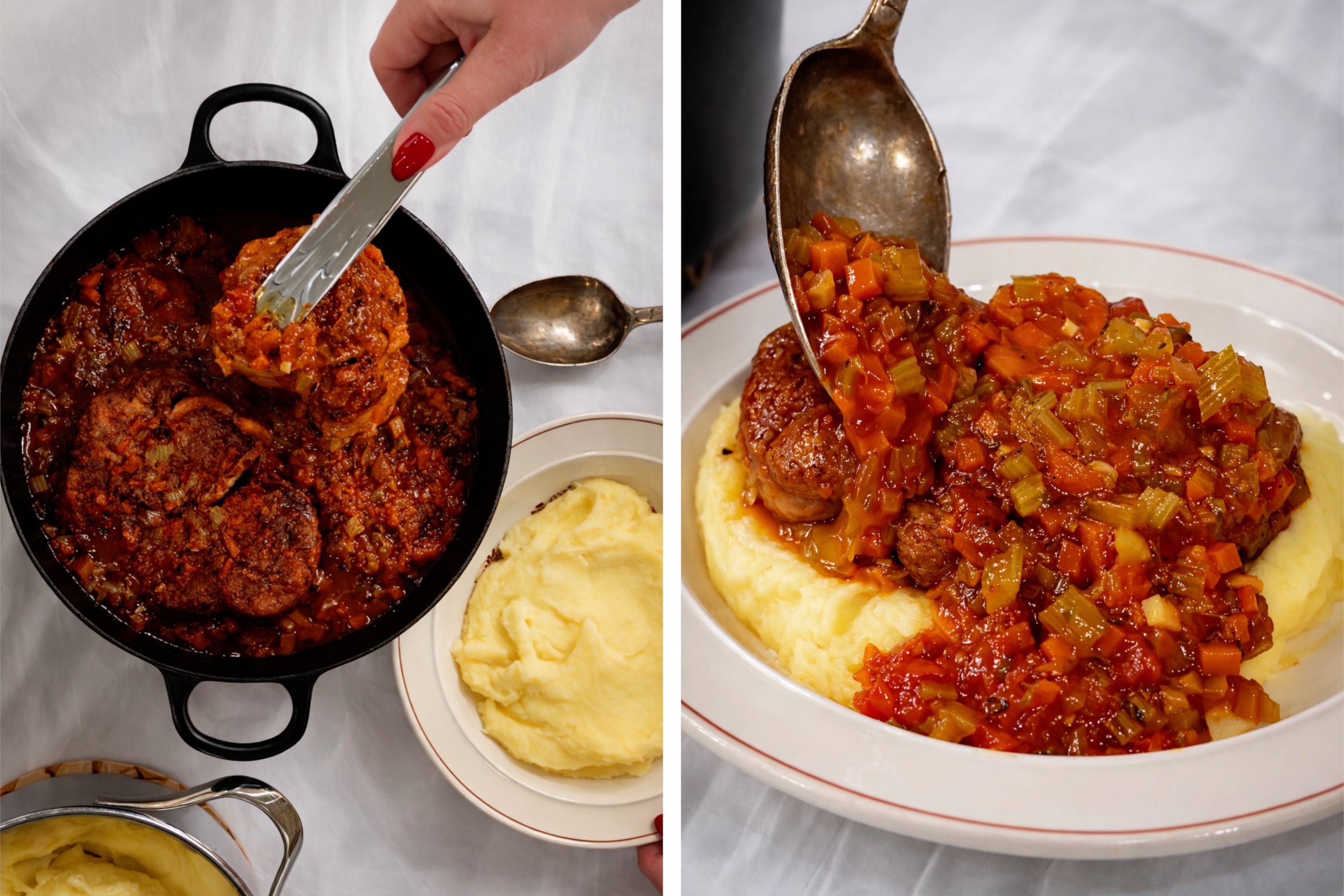 У традиційному поданні осо буко не «розбирають» повністю: м’ясо відділяють від кістки поступово, мозок дістають маленькою ложкою.