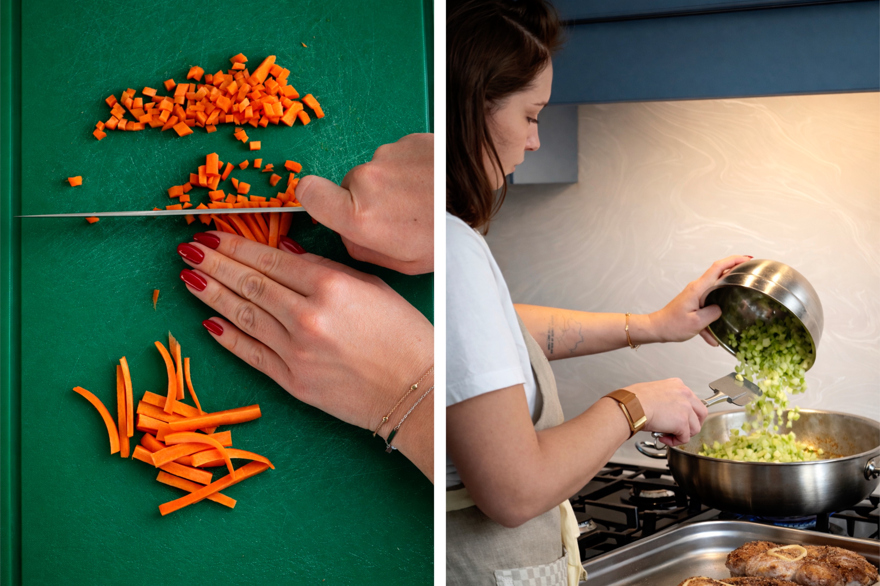 3. У ту саму сковорідку додати дрібно нарізані овочі, обсмажити до м’якості, потім додати томати.