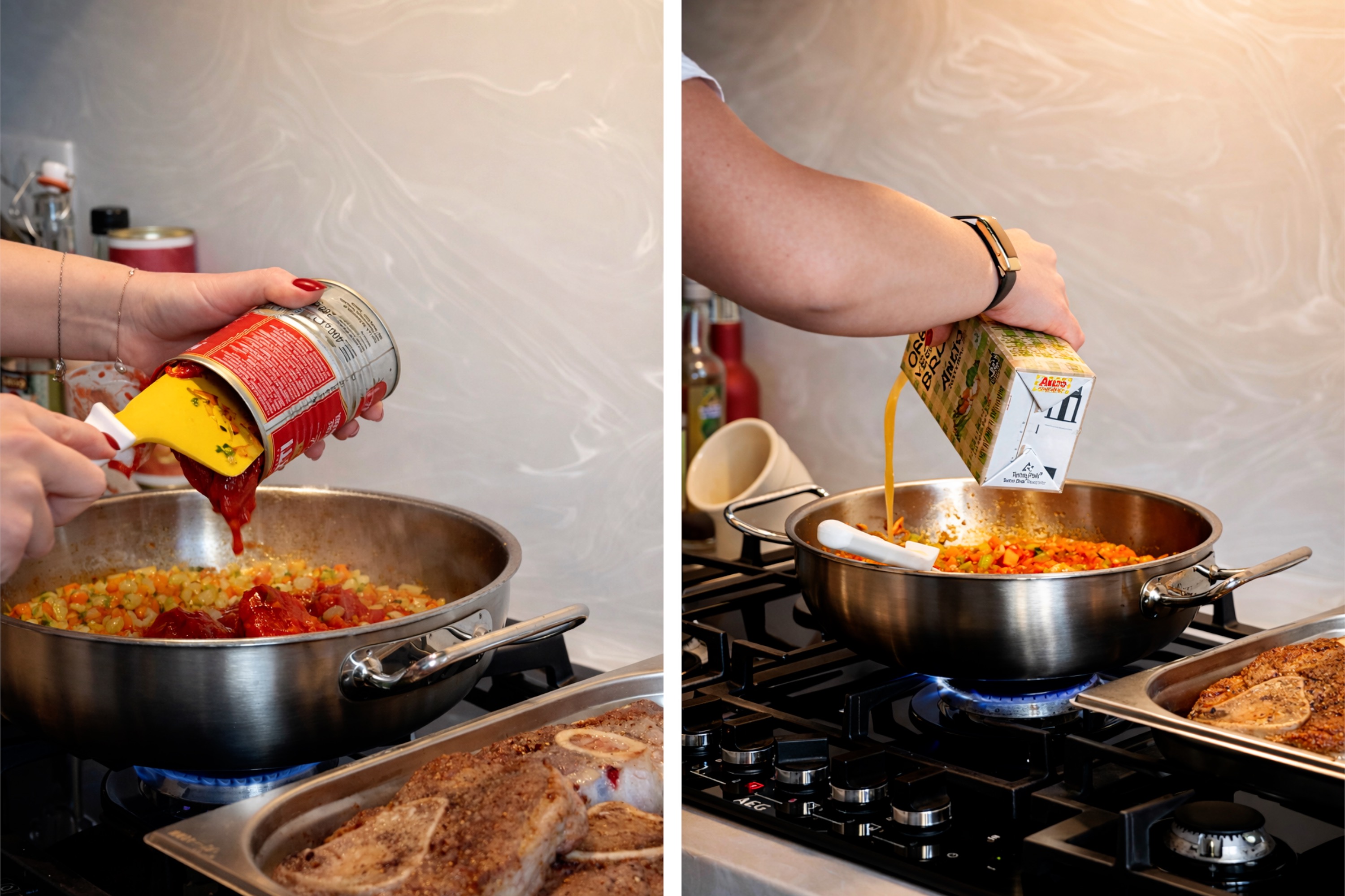 5. Повернути м’ясо, додати бульйон, тимʼян і лавровий лист.