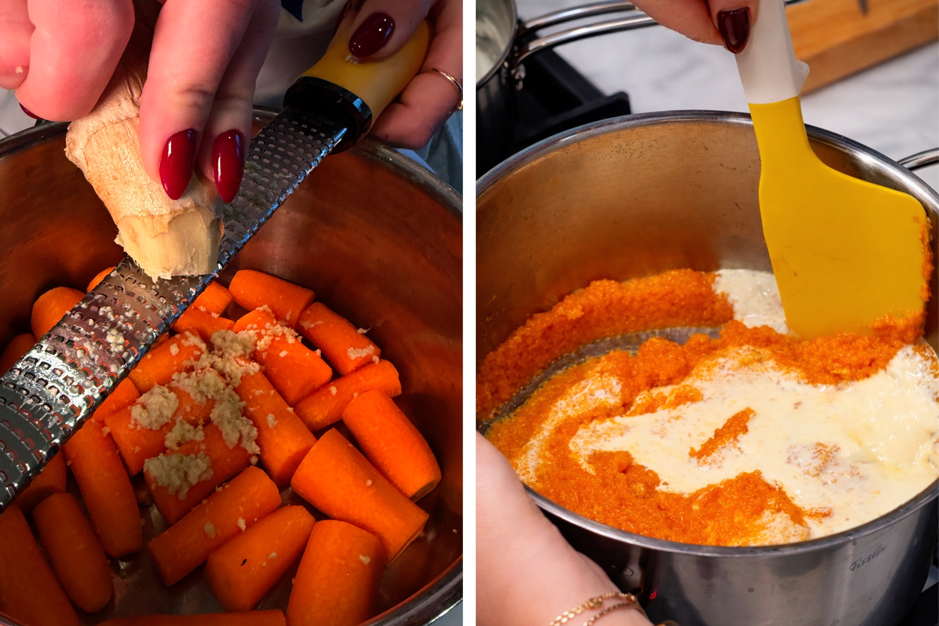 2. Моркву нарізати крупними шматками, покласти в каструлю, додати натертий імбир і залити овочевим бульйоном. Поставити варитися до мʼякості. Тоді злити майже всю рідину, перетерти моркву через сито й повернути у каструлю, додавши вершкове масло і теплі вершки. Перемішати до однорідної текстури.